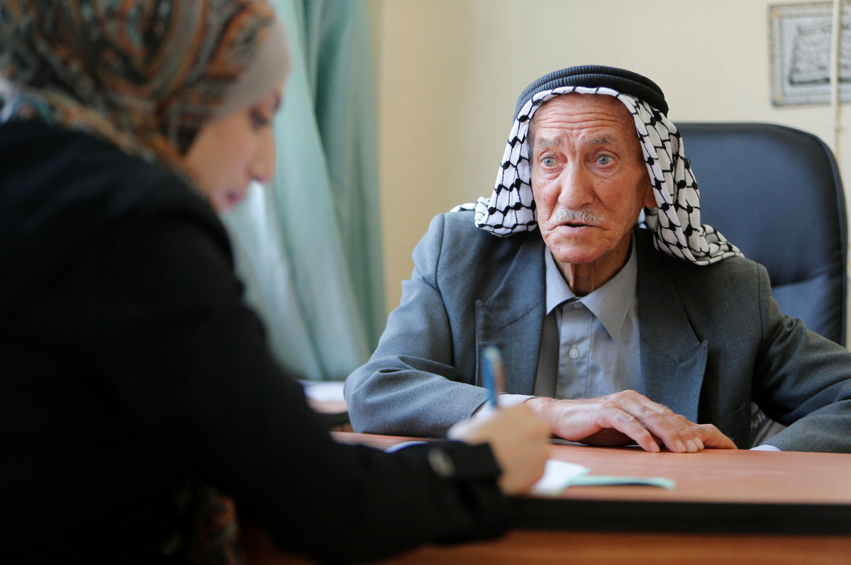 Abu Ajameyah is taking the exams in a room set aside for him at a local school. A recent stroke has restricted his hand movement, making it difficult to write, so he dictates the answers to a woman aide who fills in the papers.
