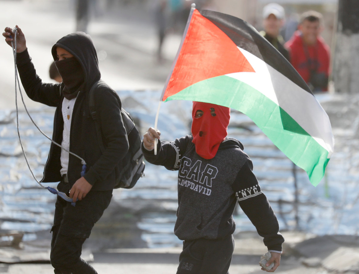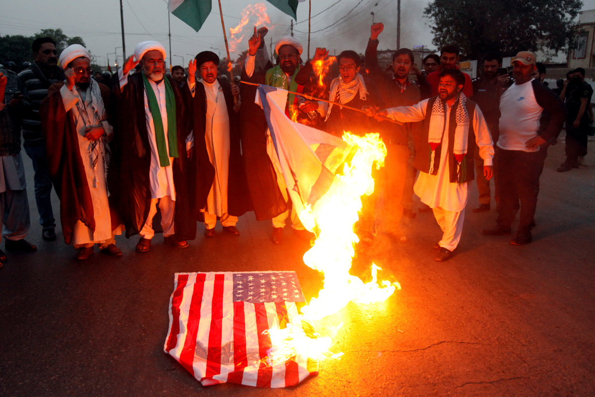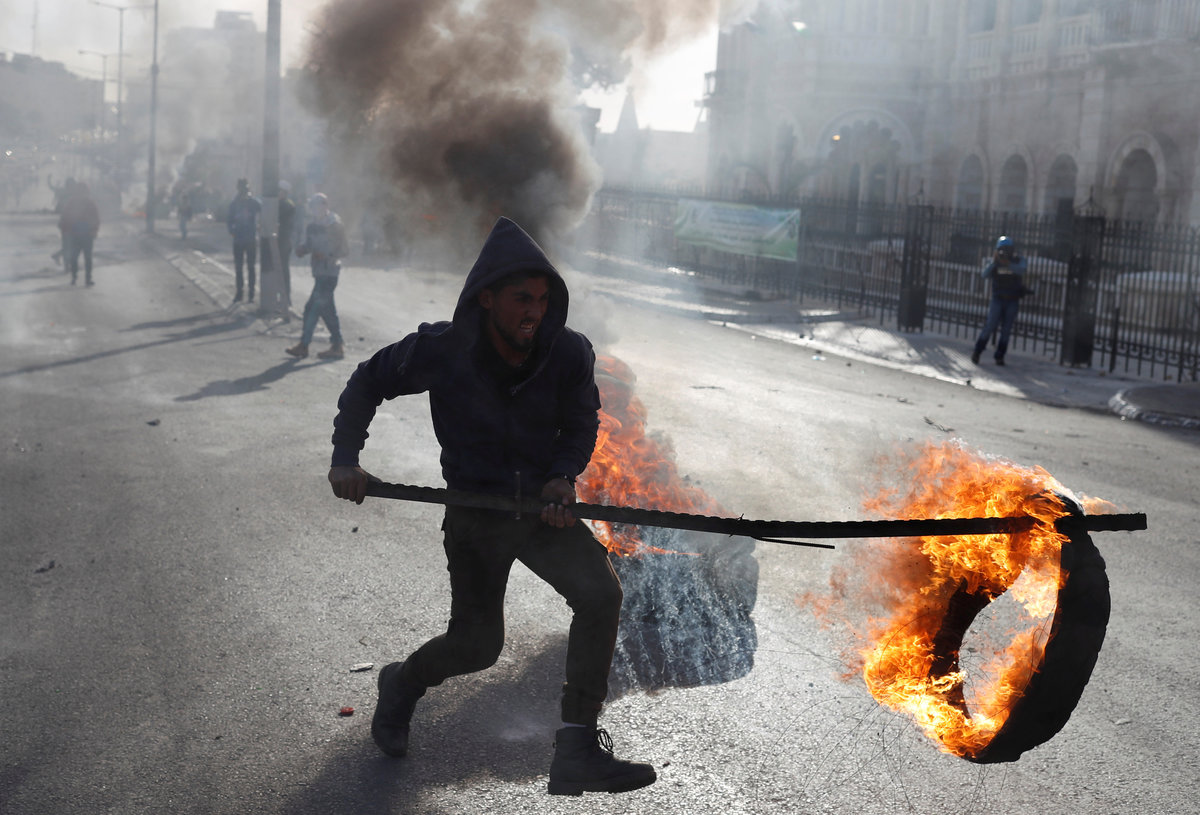 Demonstrators set fires in the street, torched U.S. and Israeli flags and threw projectiles towards security forces that had barricaded the main road to the complex.