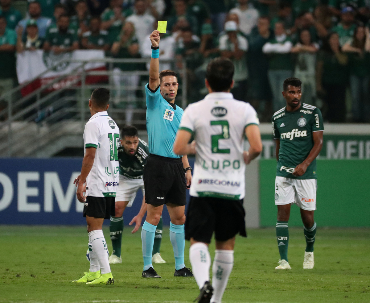 Soccer Football - Brasileiro Championship - Palmeiras v America Mineiro - Allianz Parque Stadium, Sao Paulo, Brazil - November 21, 2018 America Mineiro's Ricardo Silva is shown a yellow card by referee Paulo Roberto Alves Junior REUTERS/Ricardo MoraesSoccer Football - Brasileiro Championship - Palmeiras v America Mineiro - Allianz Parque Stadium, Sao Paulo, Brazil - November 21, 2018 Palmeiras' Dudu in action with America Mineiro's Juninho REUTERS/Ricardo MoraesSoccer Football - Brasileiro Championship - Palmeiras v America Mineiro - Allianz Parque Stadium, Sao Paulo, Brazil - November 21, 2018 Palmeiras players celebrate a goal REUTERS/Ricardo MoraesSoccer Football - Brasileiro Championship - Palmeiras v America Mineiro - Allianz Parque Stadium, Sao Paulo, Brazil - November 21, 2018 Palmeiras' Dudu celebrates scoring their third goal REUTERS/Ricardo Moraes
