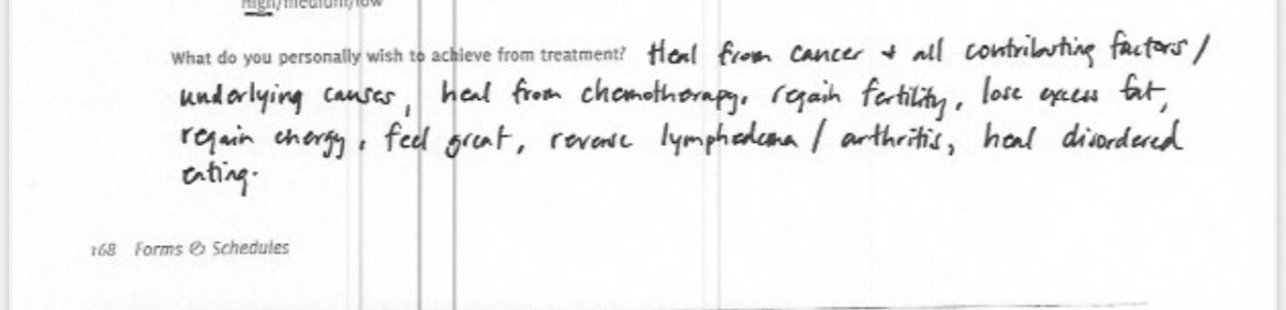 Asked what she hoped the treatment would achieve, she listed “heal from cancer and all contributing factors/underlying causes” at the top of her answer.