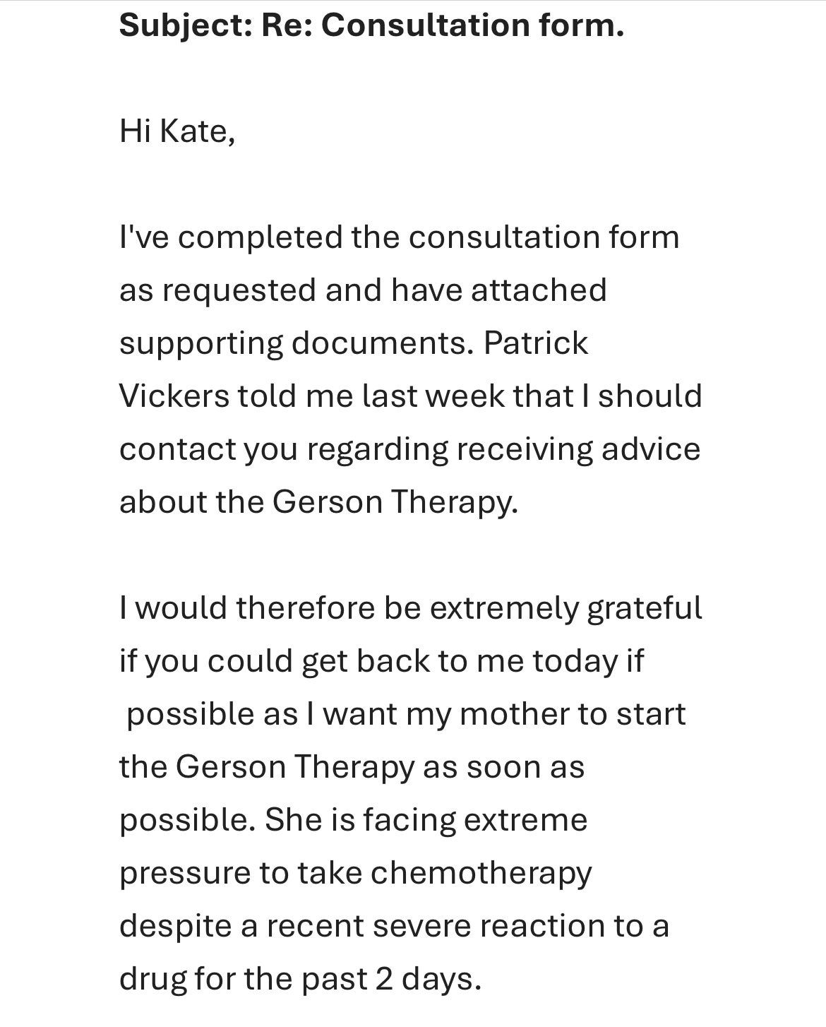 Asked what she wanted from Ms Shemirani, she wrote: “I expect to be successfully treated/healed from leukaemia using the Gerson Therapy.”