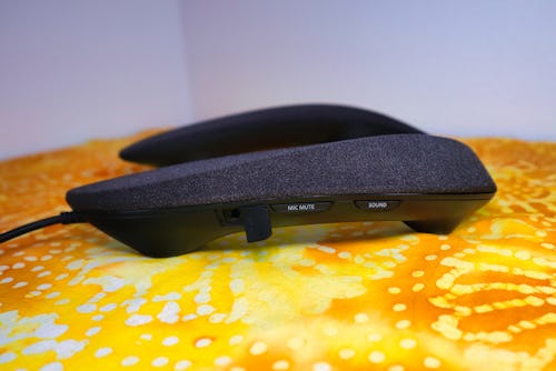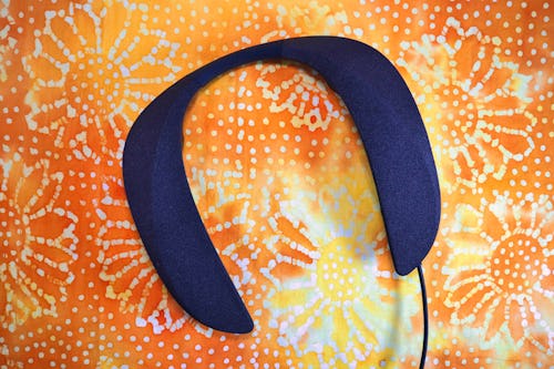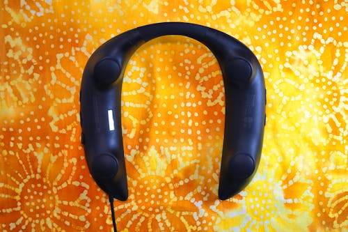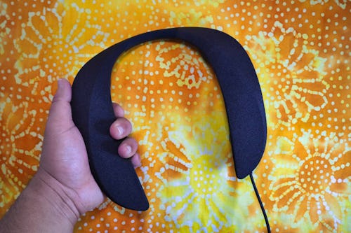 The horseshoe design looks bulky, but it’s actually lightweight and comfortable to wear for long periods; two large rubber pads on either side keep it in place on your shoulders even as you stretch or move around. It’s a weird speaker that attracts attention (it got ours!), but there’s one big caveat.