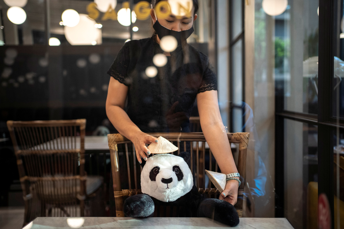 Sitting opposite one of the panda dolls, diner Sawit Chaiphuek said he was happy to have some company as he stepped out to eat for the first time in months.