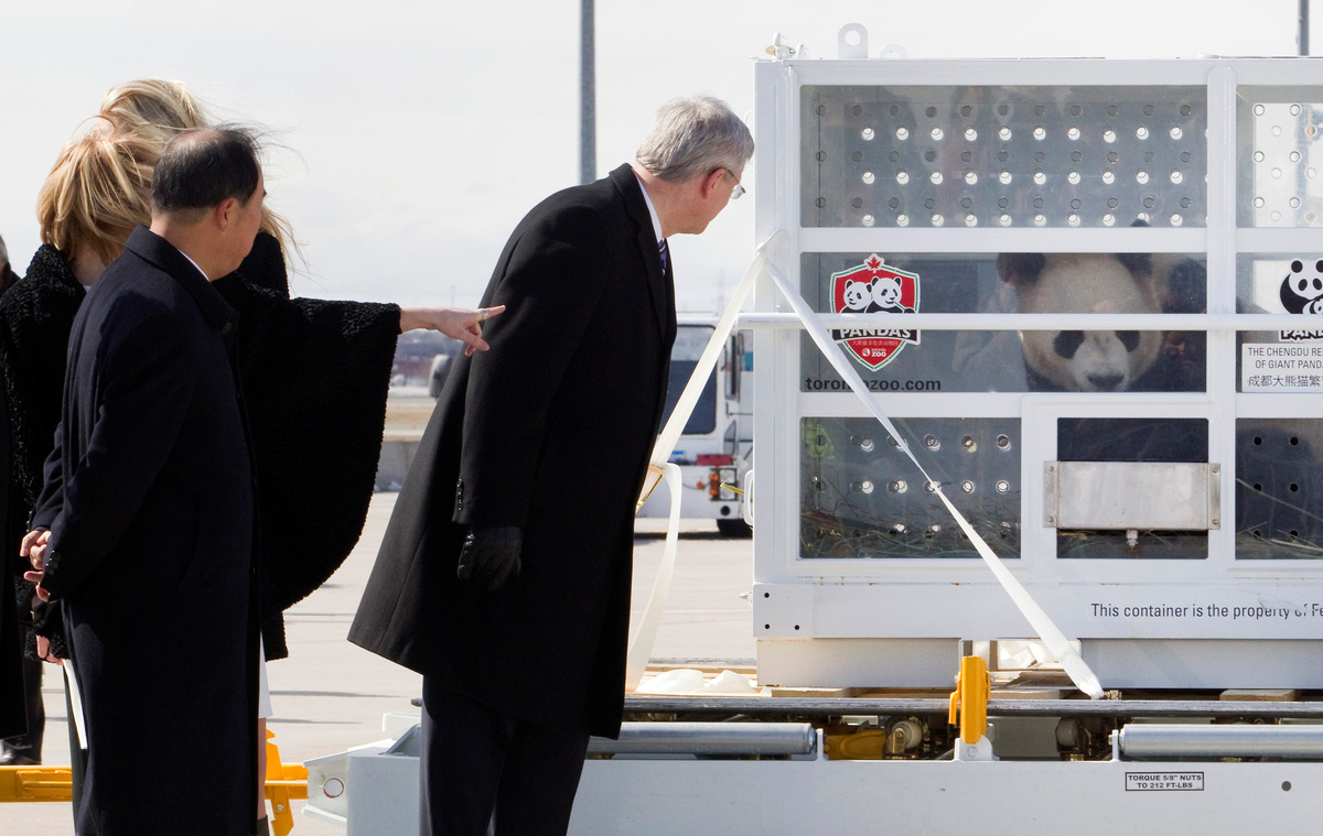 FILE PHOTO: Prime Minister Stephen Harper (R), his wife Laureen, and Zhang Junsai Ambassador of the People's Republic of China to Canada look at one of two panda bears that arrived on loan for 10 years, later to be housed at the Calgary Zoo, at Pearson International airport in Toronto, Ontario, Canada March 25, 2013. REUTERS/Fred Thornhill/File Photo
