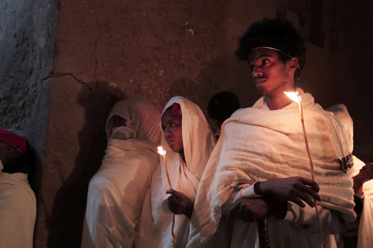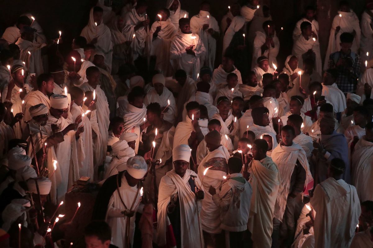 As they have done for hundreds of years on the Orthodox Easter weekend, priests wrapped in traditional white robes read the Bible by candlelight on Saturday evening in the rock-hewn churches of Lalibela in northern Ethiopia.