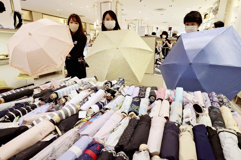 The Matsuya Ginza department store in Chuo Ward, Tokyo, is enjoying brisk sales of sun umbrellas for men. In addition to men using such umbrellas more often, many women are choosing models designed for men because the larger size makes it easier to practice social distancing.