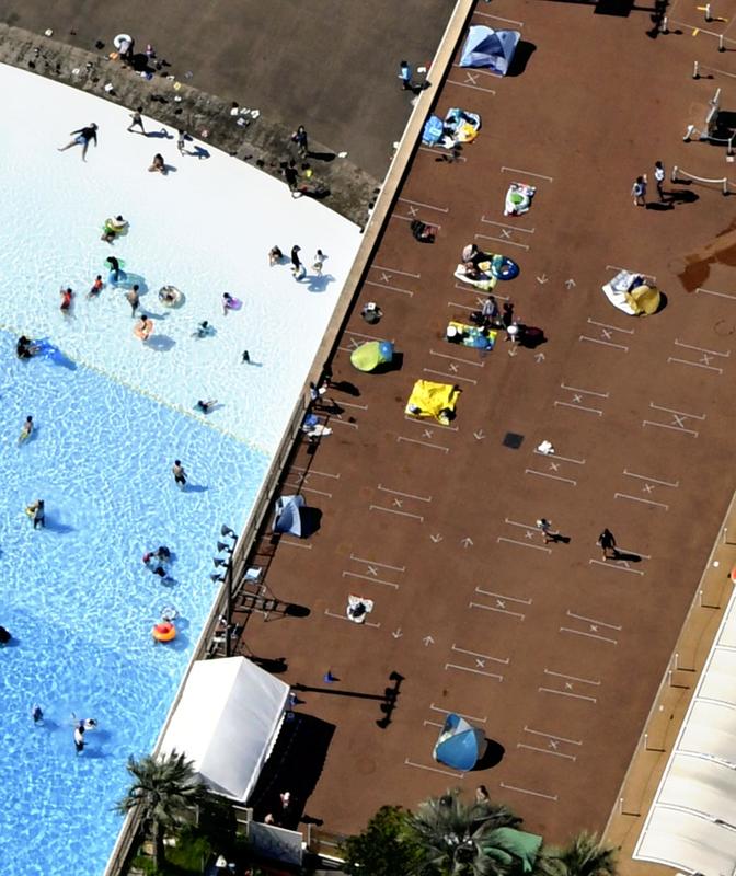 The Yomiuri Land amusement park, which straddles Inagi, Tokyo, and Kawasaki, Kanagawa Prefecture, has restricted the number of visitors to its swimming pool to about 30% of last year's level. Usually the poolside area is crowded with tents but this year, tape has been put down to encourage visitors to keep their tents a sufficient distance from each other.