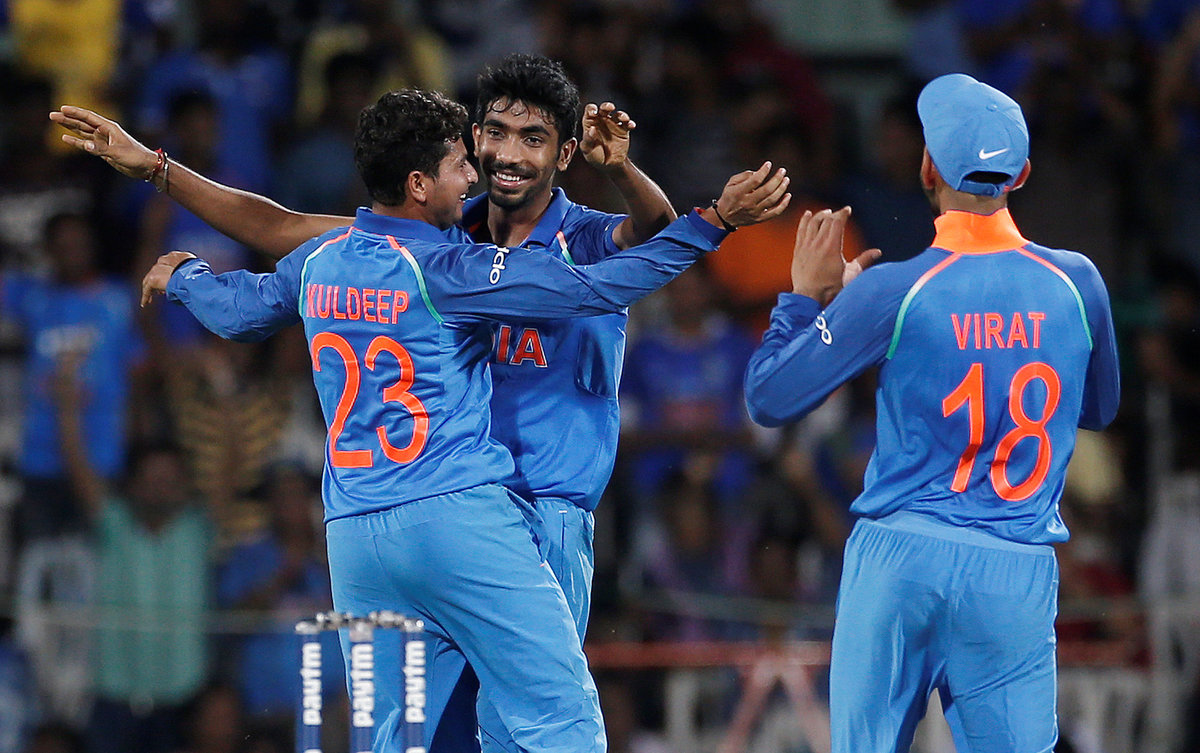 Cricket - India v Australia - First One Day International Match - Chennai, India – September 17, 2017 – Kuldeep Yadav, Jasprit Bumrah and team's captain Virat Kohli (L-R) of India celebrate the dismissal of David Warner of Australia. REUTERS/Adnan Abidi