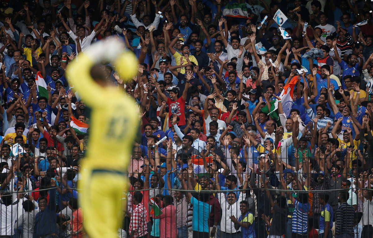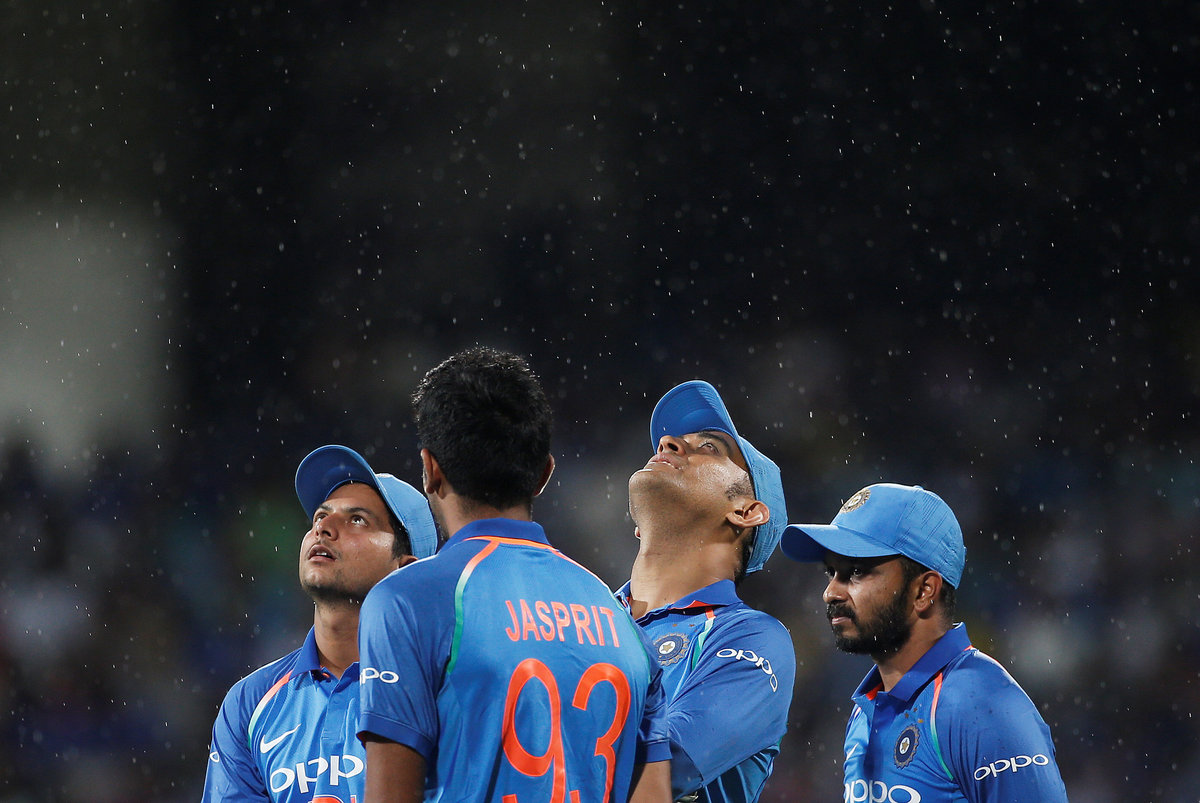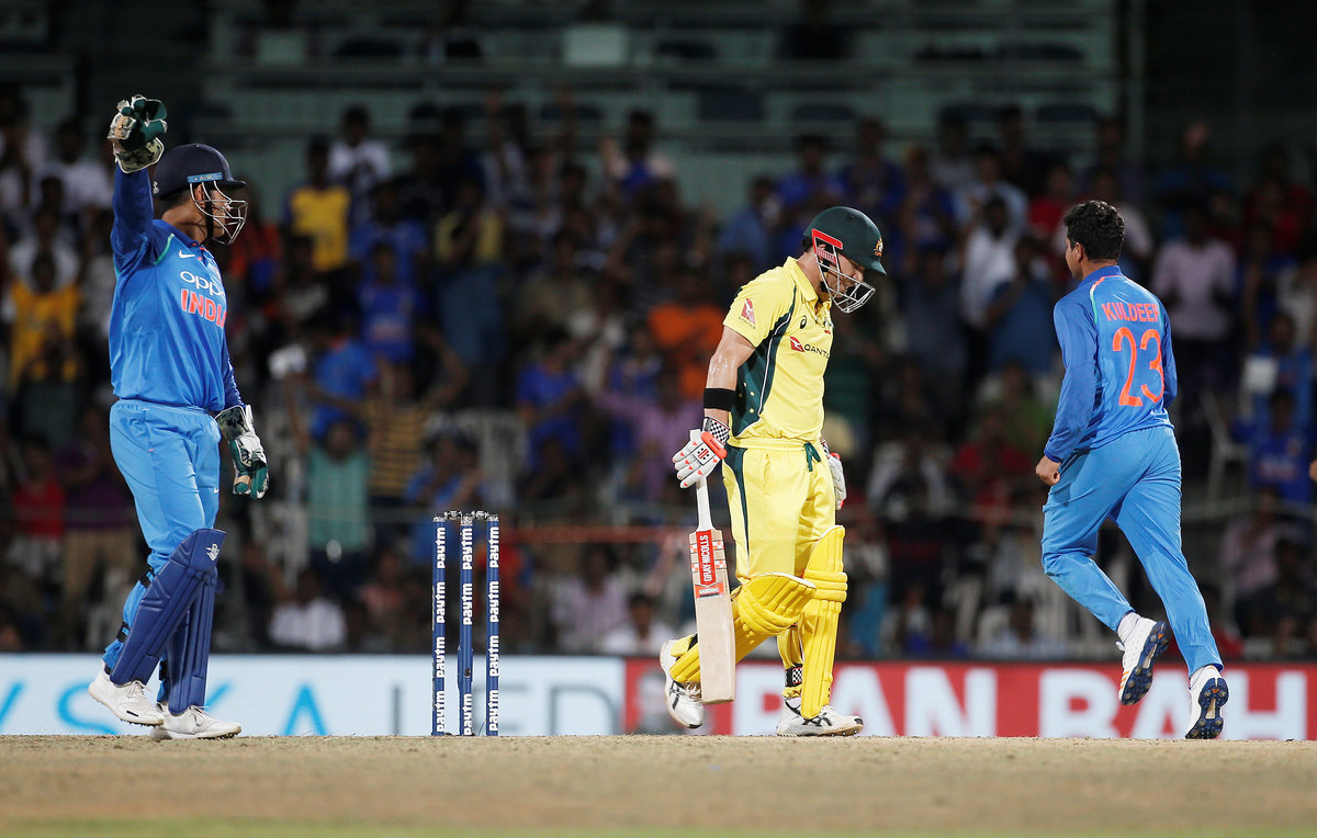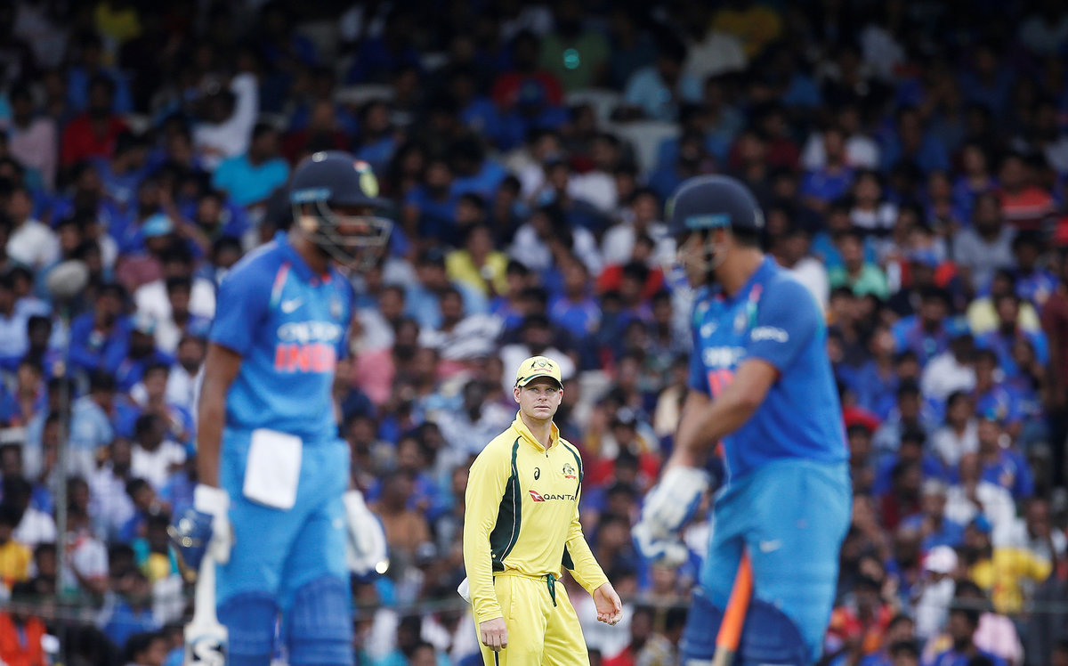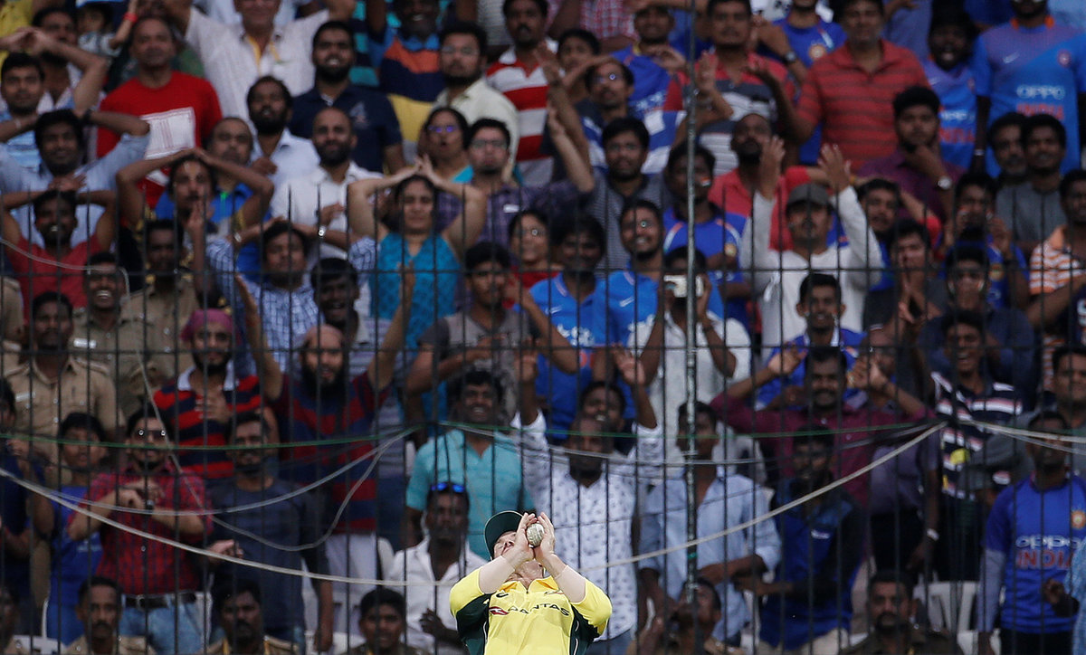 Cricket - India v Australia - First One Day International Match - Chennai, India – September 17, 2017 – Hardik Pandya of India smiles after dismissing team's captain Steven Smith of Australia. REUTERS/Adnan AbidiCricket - India v Australia - First One Day International Match - Chennai, India – September 17, 2017 – Kuldeep Yadav, Jasprit Bumrah, Mahendra Singh Dhoni and Kedar Jadhav (L-R) of India wait as rain delays the play. REUTERS/Adnan AbidiCricket - India v Australia - First One Day International Match - Chennai, India – September 17, 2017 – India's Mahendra Singh Dhoni plays a shot. REUTERS/Adnan AbidiCricket - India v Australia - First One Day International Match - Chennai, India – September 17, 2017 – Mahendra Singh Dhoni and Kuldeep Yadav (R) of India celebrate the dismissal of David Warner of Australia (C). REUTERS/Adnan AbidiCricket - India v Australia - First One Day International Match - Chennai, India – September 17, 2017 – Indian fans react as Australia's David Warner takes a catch to dismiss India's Mahendra Singh Dhoni. REUTERS/Adnan AbidiCricket - India v Australia - First One Day International Match - Chennai, India – September 17, 2017 – India's Mahendra Singh Dhoni and Hardik Pandya talks as Australia's captain Steven Smith looks on. REUTERS/Adnan AbidiCricket - India v Australia - First One Day International Match - Chennai, India – September 17, 2017 – Indian fans cheer their team as Australia's wicketkeeper Matthew Wade looks on. REUTERS/Adnan AbidiCricket - India v Australia - First One Day International Match - Chennai, India – September 17, 2017 – Australia's Nathan Coulter-Nile dives to stop the ball. REUTERS/Adnan AbidiCricket - India v Australia - First One Day International Match - Chennai, India – September 17, 2017 – India's Hardik Pandya plays a shot. REUTERS/Adnan Abidi