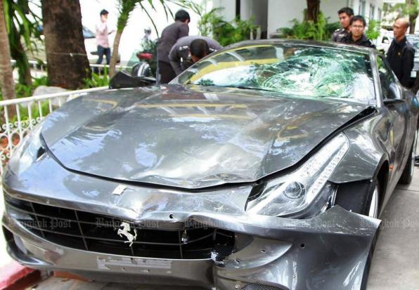 Mr Vorayuth's black Ferrari rammed into the police motorcycle on Sukhumvit Road. He then fled the scene to his house.