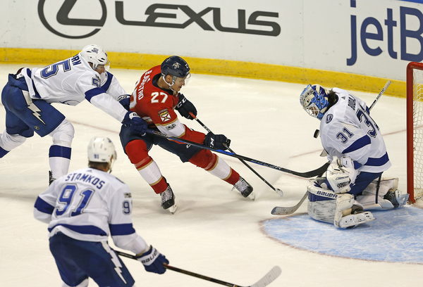 Evgenii Dadonov scored his first goal in the NHL since 2011 when he buried an Ekblad shot that rang off the post 12:18 into the first period. Dadonov gathered the loose puck in the slot and whipped it past Vasilevskiy's left shoulder. It was the Panthers' first power-play goal of the season.