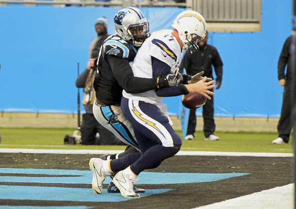 The Panthers forced five San Diego turnovers and sacked Rivers five times, with two of them resulting in fumbles recovered by Carolina.