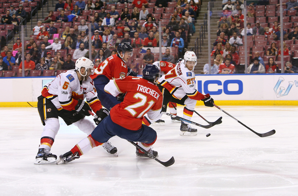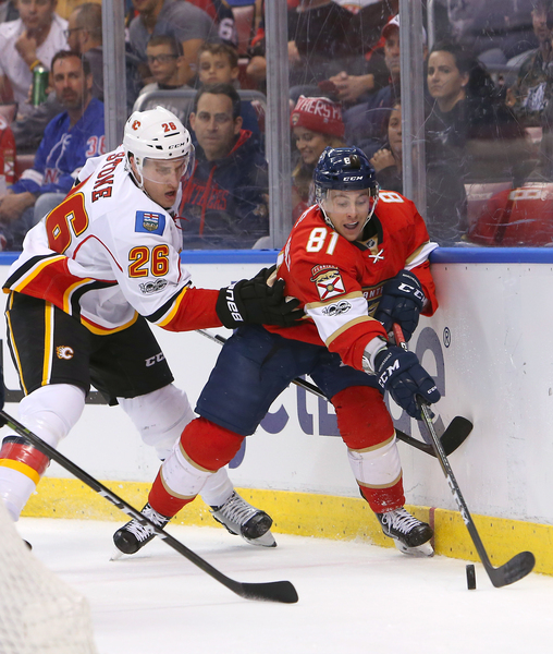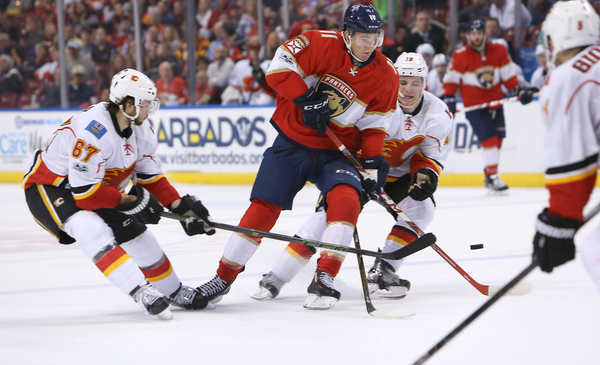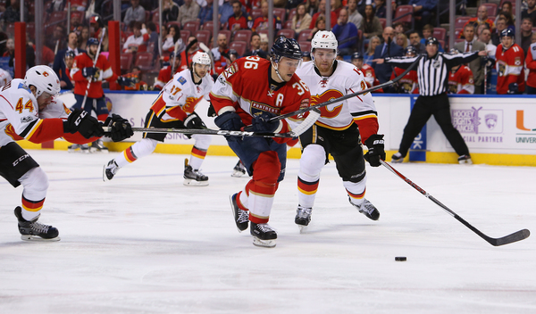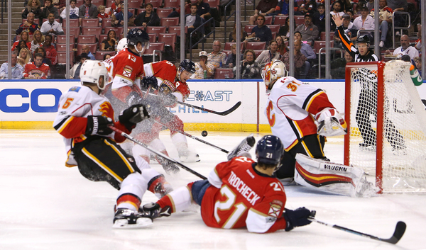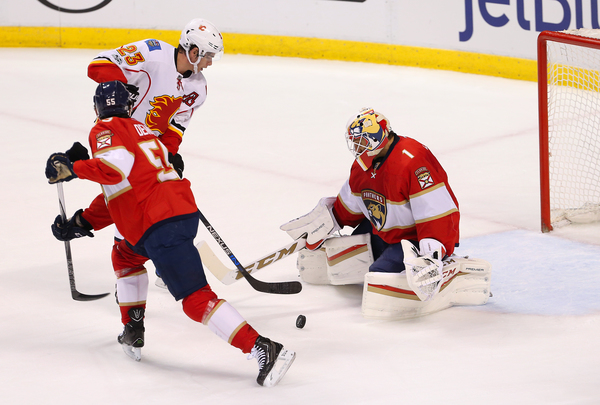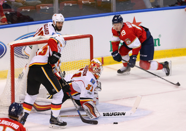 Trailing 3-2 after one, the Panthers had a few golden opportunities, but Johnson snuffed out Barkov's wrister on a 2-on-1 break. The Flames made it 4-2 at 6:19 when Matt Stajan zipped a pass across the goalmouth to Troy Bouwer, who got behind Michael Sgarbossa, for an open layup.