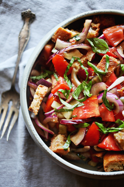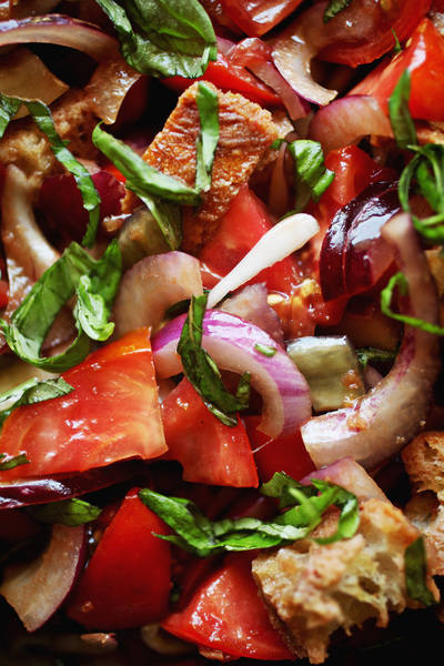 Really, every dish of panzanella has new elements because it incorporates the freshest produce available. If you're lucky to have your own garden, your salad will have fresh-from-the-soil cucumbers, just-picked tomatoes and scissor-snipped basil. If the farmer's market is your source for produce, your panzanella ingredients are likely to be very recently harvested from the farm. The latest and greatest from the vegetable patch or vine (or fruit orchard) are just the things to extend the life of your mature bread in panzanella form.
