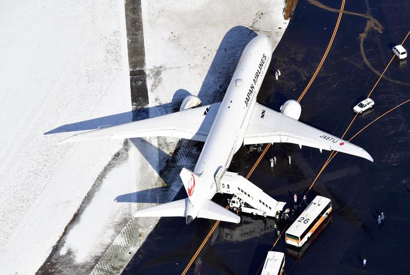 According to JAL, all 201 passengers and crew aboard the plane were uninjured. Icy pavement due to snow that started the night before is believed to have caused the accident.