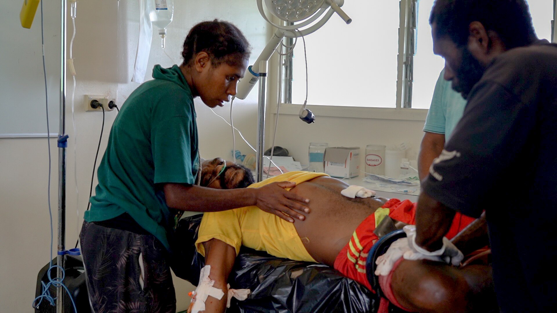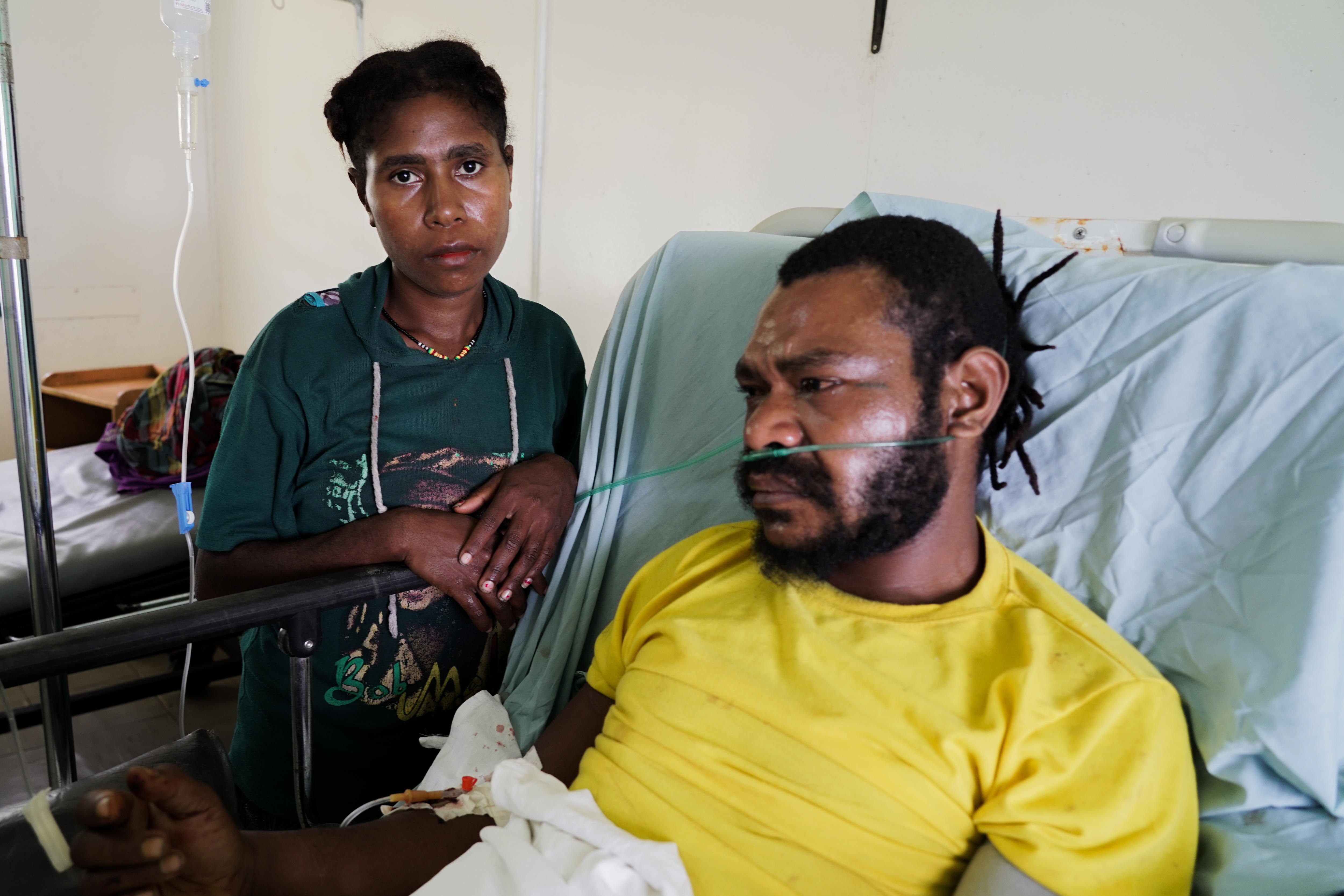 Upon landing in Etep, Dr Ganal joins health officer Bradley James to check in on Robin Balo. He is propped up in bed, with his wife Stella by his side.