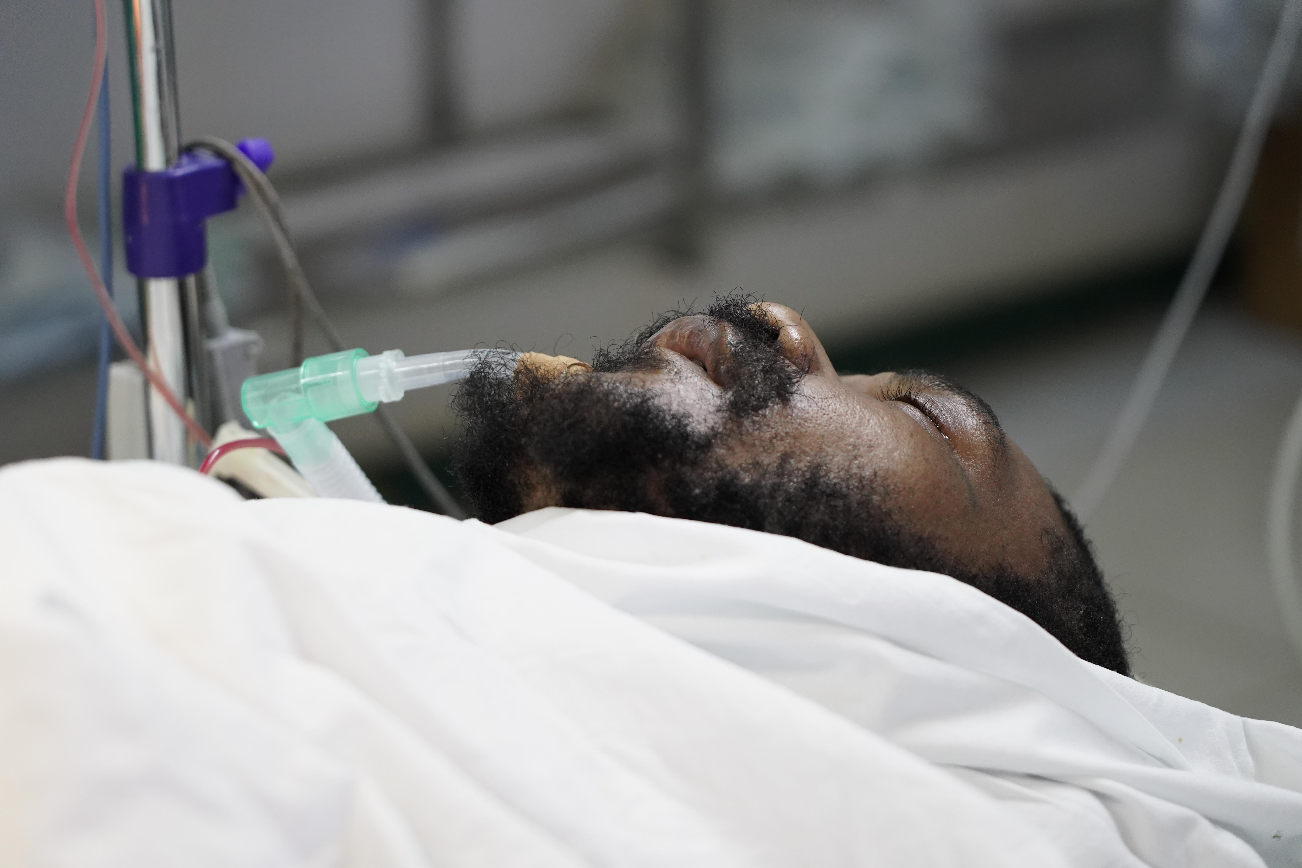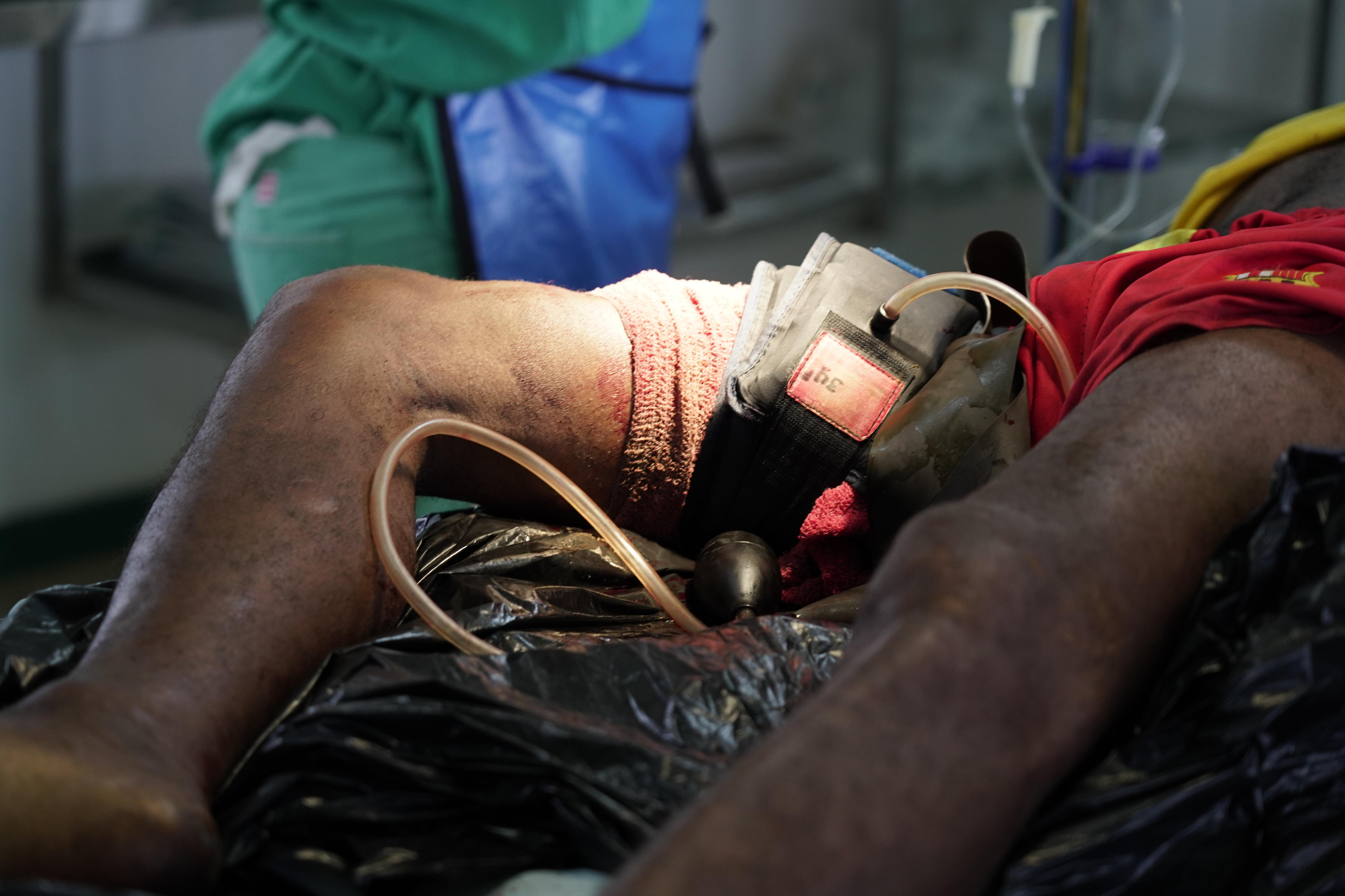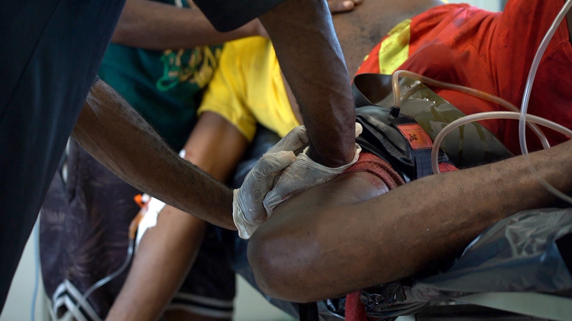 His friend dons surgical gloves and is instructed to keep pressure on the leg, while staff connect an IV and monitors, and others race to set up the surgery.