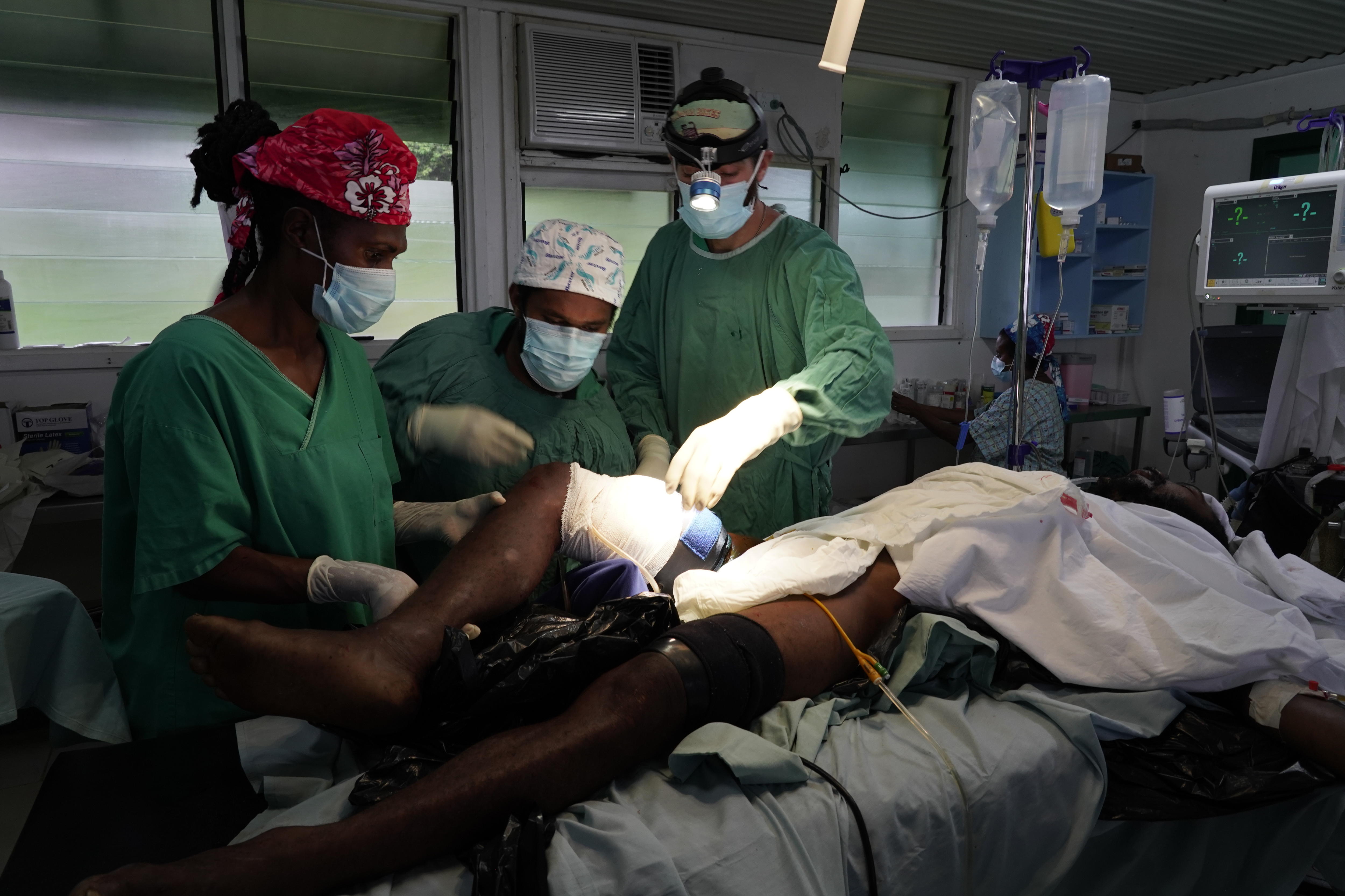 As they operate, a staff member from the helicopter that flew Dr Ganal into Etep has her blood type checked and discovers it is universal. As the surgery continues, she donates 500ml. There are now three bags of blood to use.