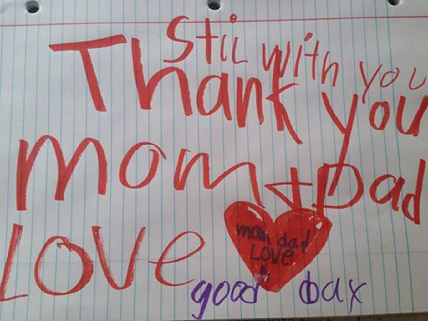 The letter reads "Still with you. Thank you mom and dad. Love. Good day". Three words: love, mom and dad, appear in a heart.