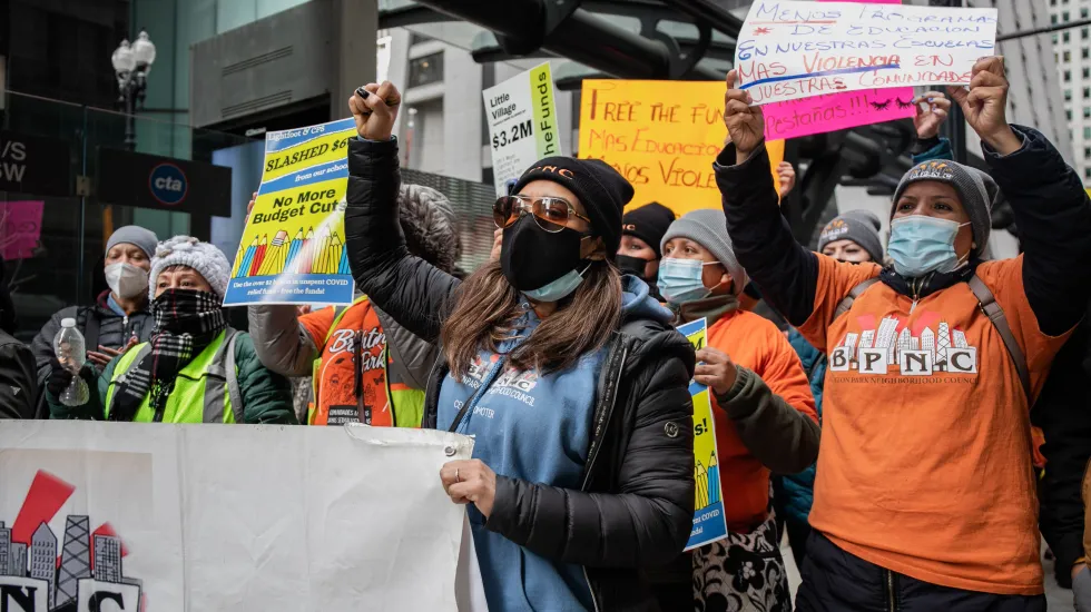 In front of a crowd chanting “free the funds” in reference to federal COVID-19 relief money sent to CPS, Mariana Alvarez said she and fellow parents “need answers. ... Why are these budget cuts taking place?”