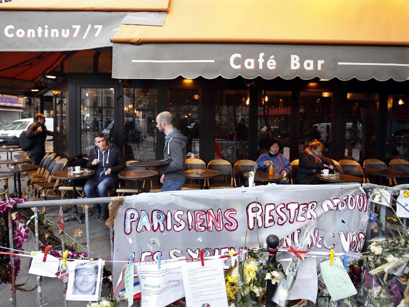 In the wake of the carnage, the café became a hub for Parisians to express their collective grief, piling up tributes outside and posting messages and flowers in the bullet holes riddling its windows.