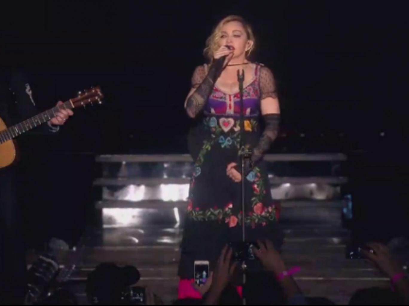Madonna went ahead with a concert in Stockholm, Sweden on Saturday, but stopped the show mid-way to respond to the tragedy in a tearful, six-minute address.