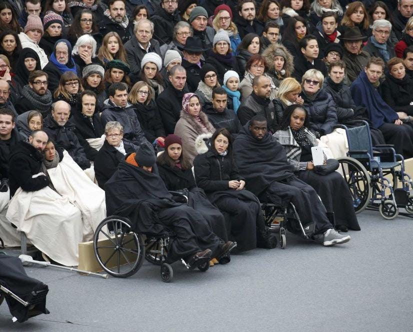 The wheelchair-bound survivors of the Paris terror attacks have attended a solemn memorial service as tricolore flags fluttered from windows across the French capital.