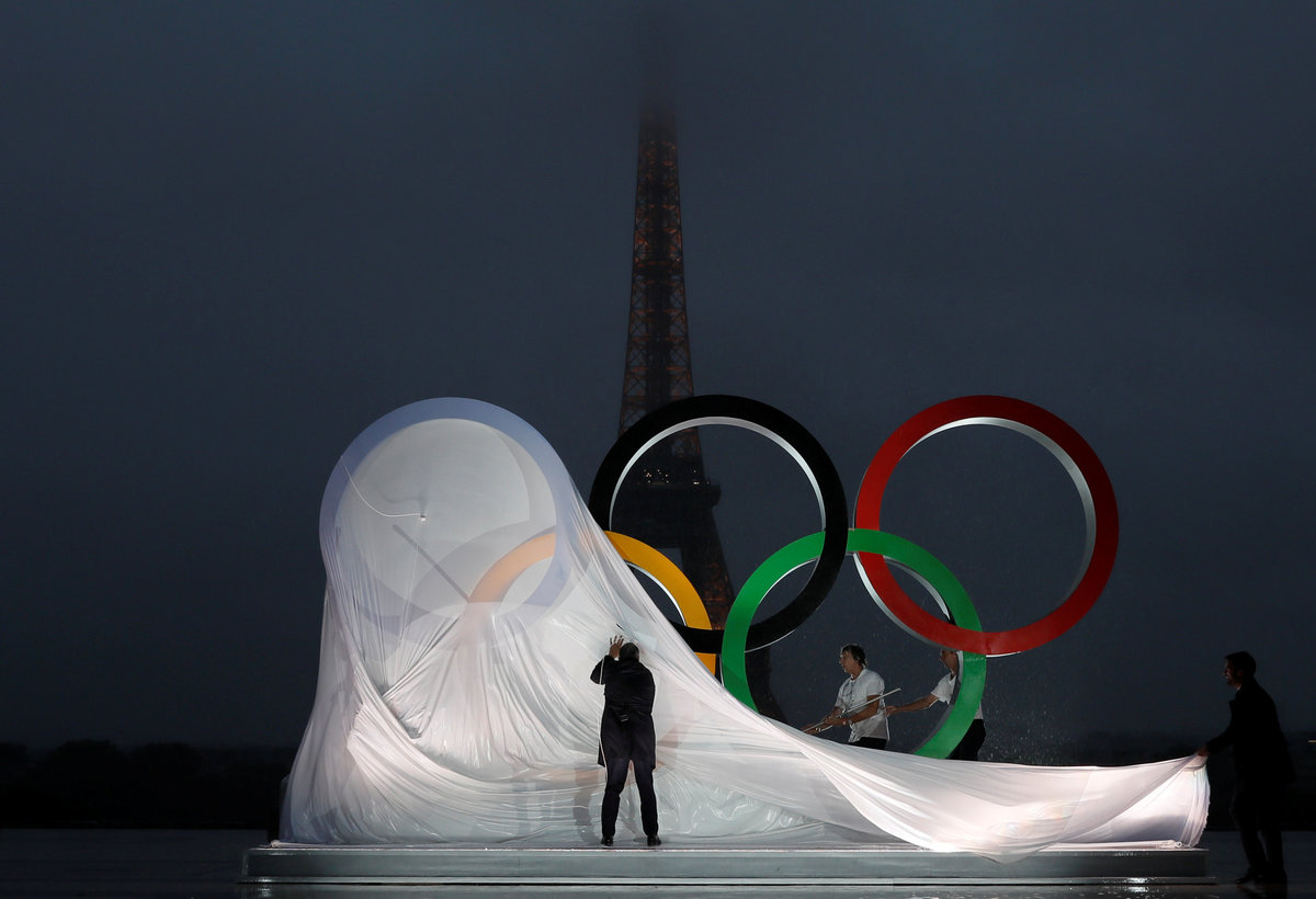 The announcement was celebrated in Paris with the unveiling of a giant set of interlaced rings, the symbol of the Games, in a heavy downpour on the Trocadero square with lights glittering on the Eiffel Tower in the background.
