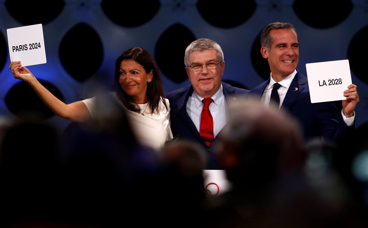 France Minister of Sport Laura Flessel gives a speech at the presentation of Paris 2024 at the 131st IOC session in Lima, Peru September 13, 2017. REUTERS/Mariana BazoInternational Olympic Committee (IOC) member and Co-Chairman Paris 2024 Tony Estanguet gives a speech at the presentation of Paris 2024 at the 131st IOC session in Lima, Peru September 13, 2017. REUTERS/Mariana BazoInternational Olympic Committee (IOC) President Thomas Bach next Mayor of Los Angeles Eric Garcetti ratifies Paris 2024 and Los Angeles 2028 host cities for Olympics games during the 131st IOC session in Lima, Peru September 13, 2017. REUTERS/Mariana BazoInternational Olympic Committee (IOC) member and Co-Chairman of Paris 2024 Tony Estanguet reacts during the 131st IOC session in Lima, Peru, September 13, 2017. REUTERS/Guadalupe PardoInternational Olympic Committee (IOC) member and Co-Chairman of Paris 2024 Tony Estanguet reacts after the ratification of Paris 2024 and Los Angeles 2028 host cities for Olympic games during the 131st IOC session in Lima, Peru, September 13, 2017. REUTERS/Guadalupe PardoChairman of Los Angeles 2028 Casey Wasserman (R) and Mayor of Los Angeles Eric Garcetti react after the ratification of Paris 2024 and Los Angeles 2028 host cities for Olympics games during the 131st IOC session in Lima, Peru September 13, 2017. REUTERS/Mariana BazoMayor of Los Angeles Eric Garcetti gives a speech at the presentation of Los Angeles 2028 at the 131st IOC session in Lima, Peru September 13, 2017. REUTERS/Mariana BazoFrance's President Emmanuel Macron is seen on a screen as he delivers a video speech at the presentation of Paris 2024 at the 131st IOC session in Lima, Peru September 13, 2017. REUTERS/Mariana BazoInternational Olympic Committee (IOC) President Thomas Bach next to Mayor of Paris Anne Hidalgo ratifies Paris 2024 and Los Angeles 2028 host cities for Olympics games during the 131st IOC session in Lima, Peru September 13, 2017. REUTERS/Mariana BazoParisians, athletes and officials pose in front of Olympic rings to celebrate the IOC official announcement that Paris won the 2024 Olynpic bid during a ceremony at the Trocadero square in Paris, France, September 13, 2017 . REUTERS/Gonzalo FuentesOfficials unveil Olympic rings to celebrate the IOC official announcement that Paris won the 2024 Olynpic bid during a ceremony at the Trocadero square in Paris, France, September 13, 2017 . REUTERS/Gonzalo FuentesInternational Olympic Committee (IOC) President Thomas Bach gives a speech at the 131st IOC session in Lima, Peru September 13, 2017. REUTERS/Mariana BazoOlympic rings to celebrate the IOC official announcement that Paris won the 2024 Olynpic bid are seen during a ceremony at the Trocadero square in Paris, France, September 13, 2017 . REUTERS/Gonzalo FuentesAn inflatable 2024 logo are seen at Marseille's old harbor during celebrations after the IOC official announcement that Paris won the 2024 Olympic bid, France, September 13, 2017. REUTERS/Jean-Paul PelissierPresident of the Ile-de-France region Valerie Pecresse gives a speech at the presentation of Paris 2024 at the 131st IOC session in Lima, Peru September 13, 2017. REUTERS/Mariana BazoView of the 131st IOC session in Lima after the ratification of Paris 2024 and Los Angeles 2028 host cities for Olympics games in Lima, Peru September 13, 2017. REUTERS/Mariana Bazo