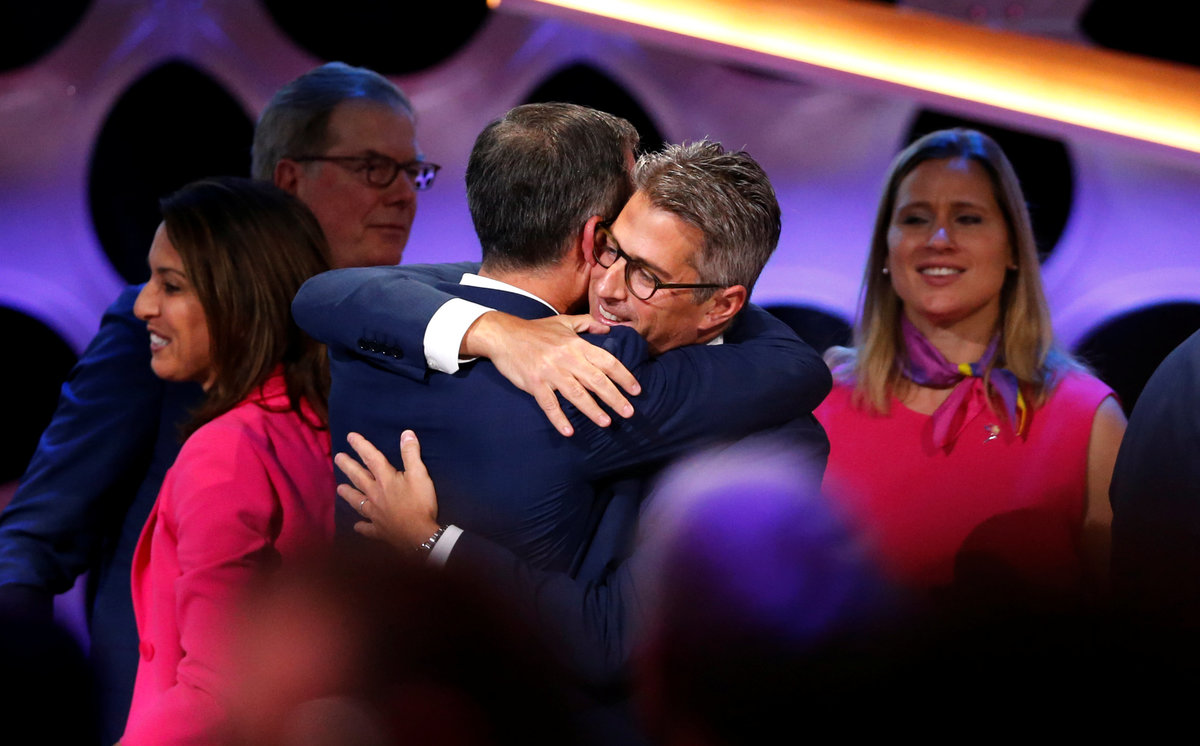 IOC President Thomas Bach embraced both cities' mayors on stage after a unanimous show of hands by IOC members ratified the awards.