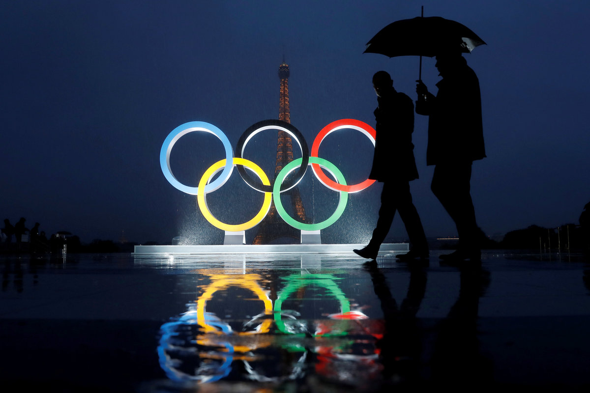 Men walk in the rain under an umbrella next to the Olympic rings after the IOC officially announced that Paris won the 2024 Olympic bid during a ceremony at the Trocadero square near the Eiffel Tower in Paris, France, September 13, 2017. REUTERS/Gonzalo Fuentes