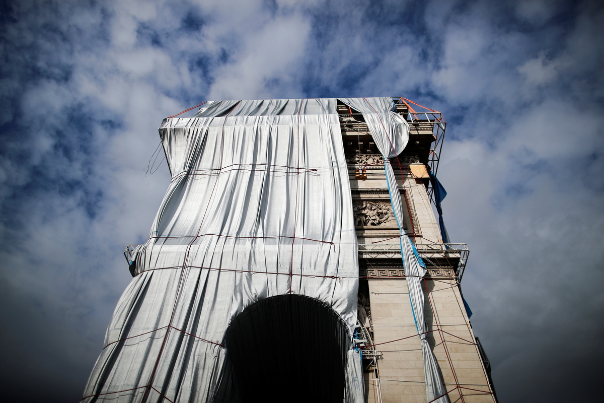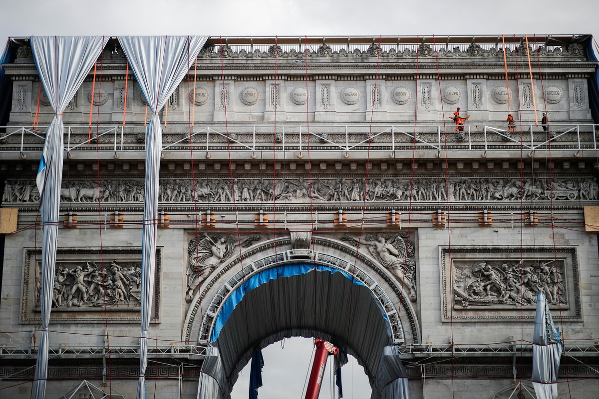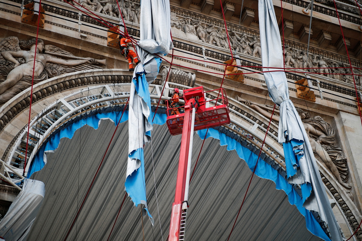The plan to encase the 19th century arch was originally conceived by the late Bulgarian-born artist Christo and carried out posthumously by a team that included his nephew at a cost of about 14 million euros ($16.3 million).