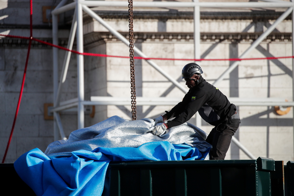 The installation was scheduled to run until Sunday, and on Monday morning, workers began the operation to take it down, rappelling from the top of the 50-metre (164-foot) tall monument.