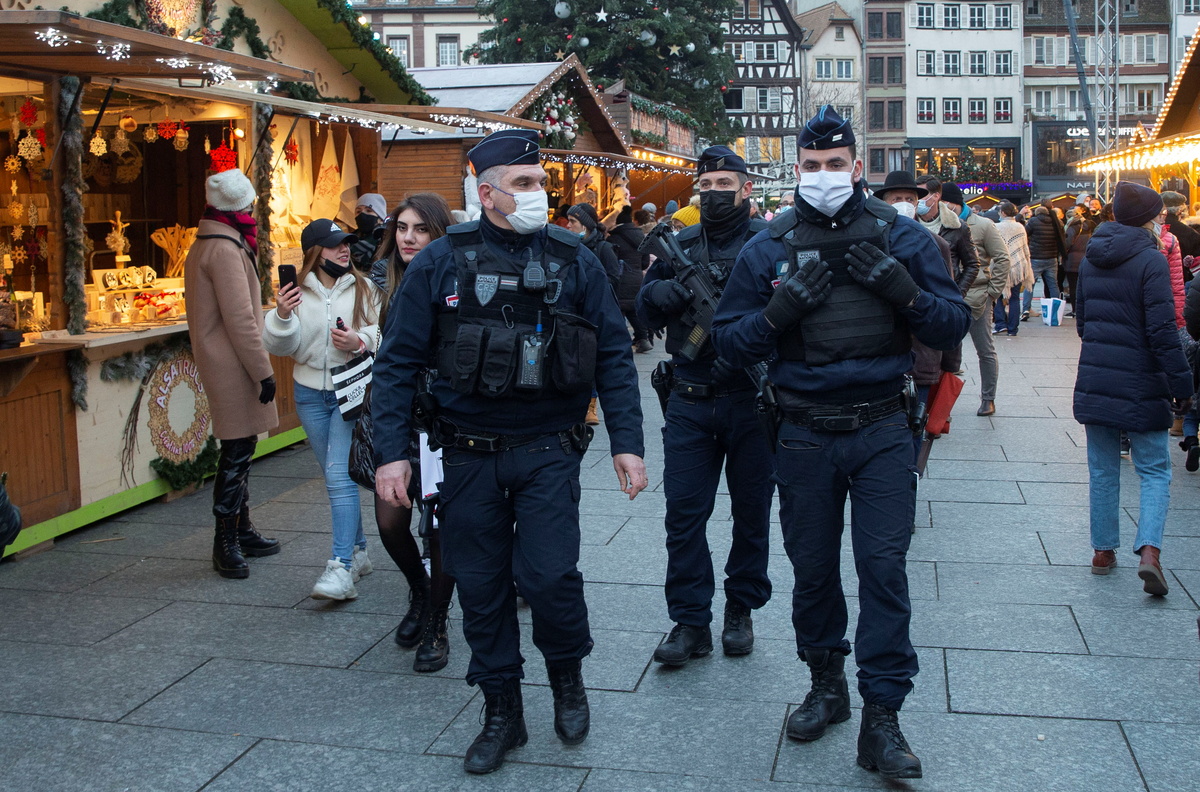 French police officers patrol at a Christmas market on the Place Kleber square in Strasbourg, France November 26, 2021. REUTERS/Arnd Wiegmann