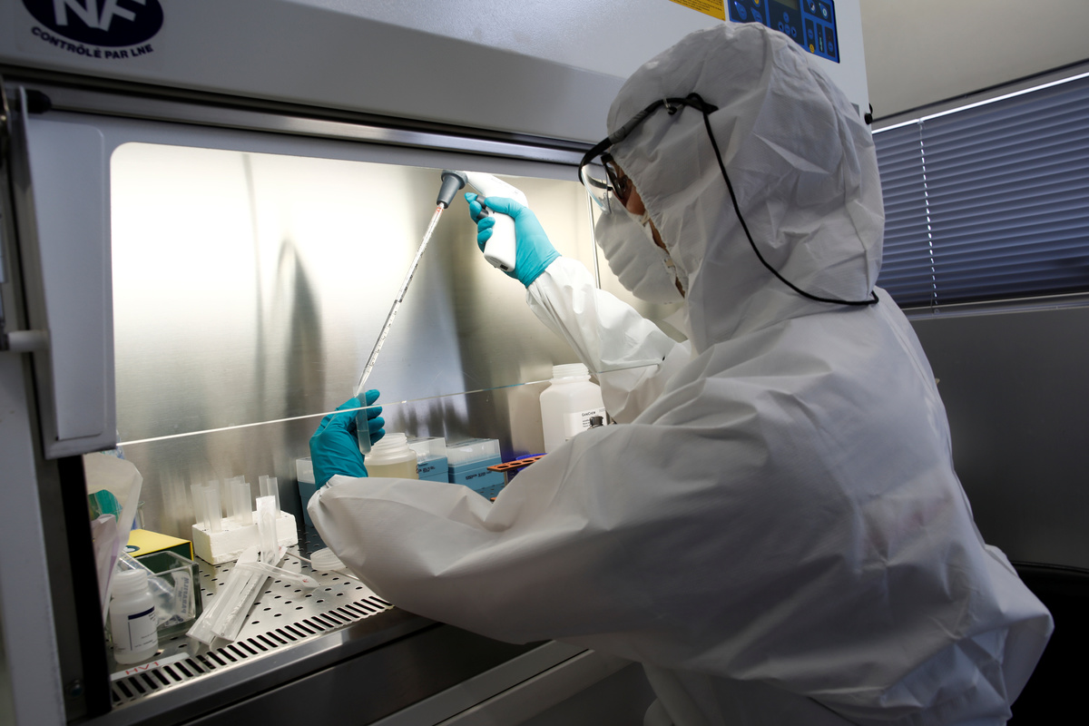 Workers at a sewage plant in Noisy-le-Grand, on the eastern edge of Paris, fill plastic bottles with waste water and put them in a cool box. These are then ferried to the laboratory, on the southern outskirts of the city, where researchers in biohazard suits and masks analyse them.