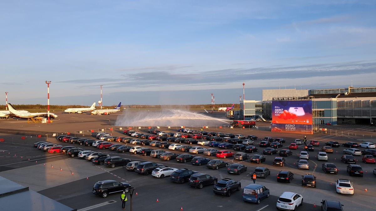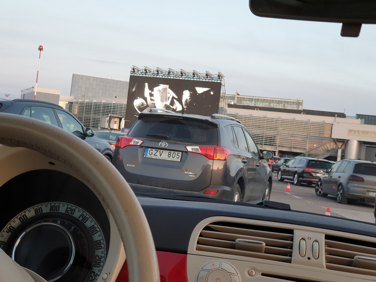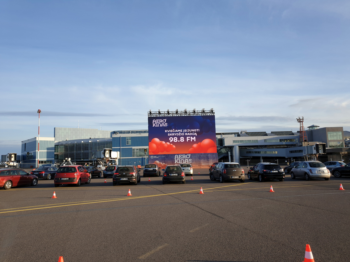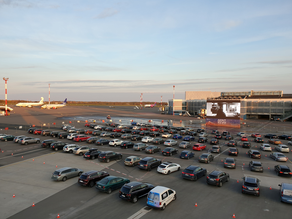 A cargo airplane took off from Vilnius airport on Thursday, while just a few hundred meters away people watched a movie from their cars at a makeshift drive-in cinema on the airport tarmac.