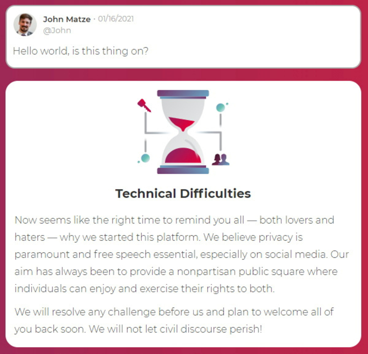 He said this occurred after Parler resisted his efforts following the riot to ban "identifiable extremist groups like QAnon and neo Nazis," while preserving the platform as a forum for free expression.