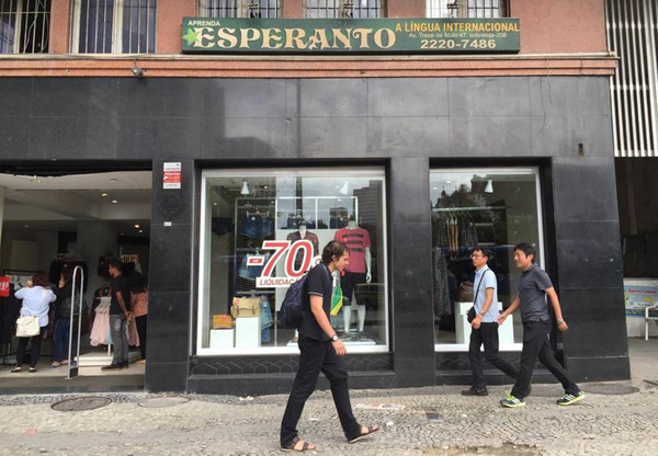 In Rio's bustling downtown business district there's a giant green sign _ the color of the Esperanto flag _ with "Esperanto" written in bold letters and a phone number to call. On the other end of that line is a very enthusiastic Givanildo Ramos Costas.