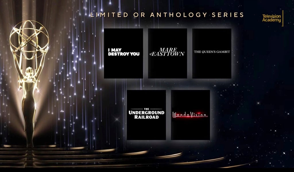 Limited Series: “The Queen’s Gambit” Netflix; “I May Destroy You,” HBO; “Mare of Easttown,” HBO; “The Underground Railroad,” Amazon; “WandaVision,” Disney+.