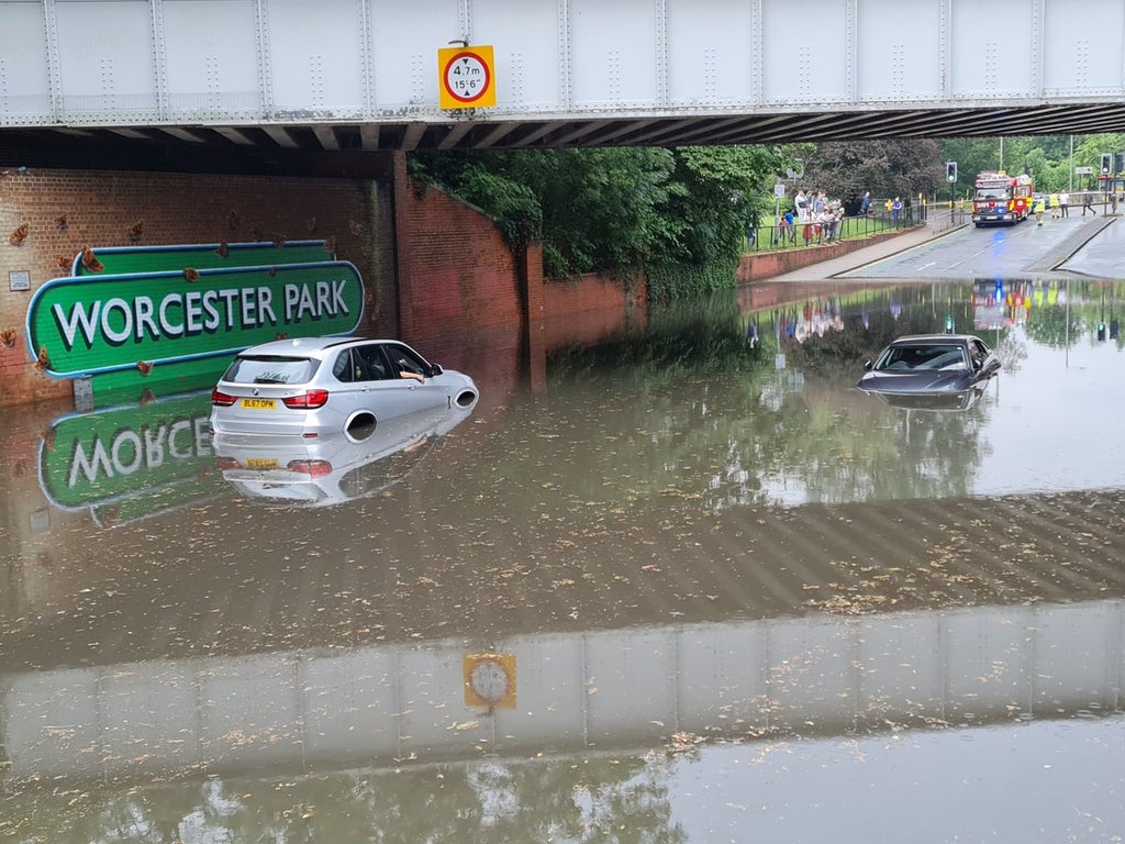 In Worcester Park, Sutton, a man is seen walking through flood water that reaches his mid-thigh – in a photo posted to Twitter.