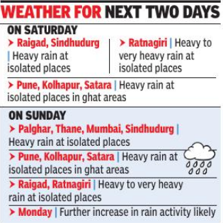 PUNE: The next few days of Ganeshotsav are expected to be wet with the monsoon set to gather pace again. At least six districts in Maharashtra have been put on an orange alert for September 13-14 with chances of isolated heavy to very heavy rain in these regions, including Pune district’s ghat areas, India Meteorological Department (IMD) officials told TOI on Friday.