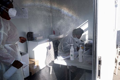 “A health worker sprays sanitiser in a COVID-19 testing site in Johannesburg on June 28, 2021. by Emmanuel Croset / AFP via Getty Images