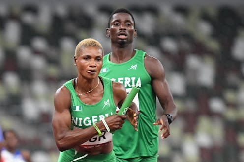 “Nigeria’s Ifeanyi Emmanuel Ojelli (rear) and Imaobong Nse Uko compete in the mixed 4x400m relay heats during the Tokyo 2020 Olympic Games at the Olympic Stadium in Tokyo on 30 July 2021. Photo by