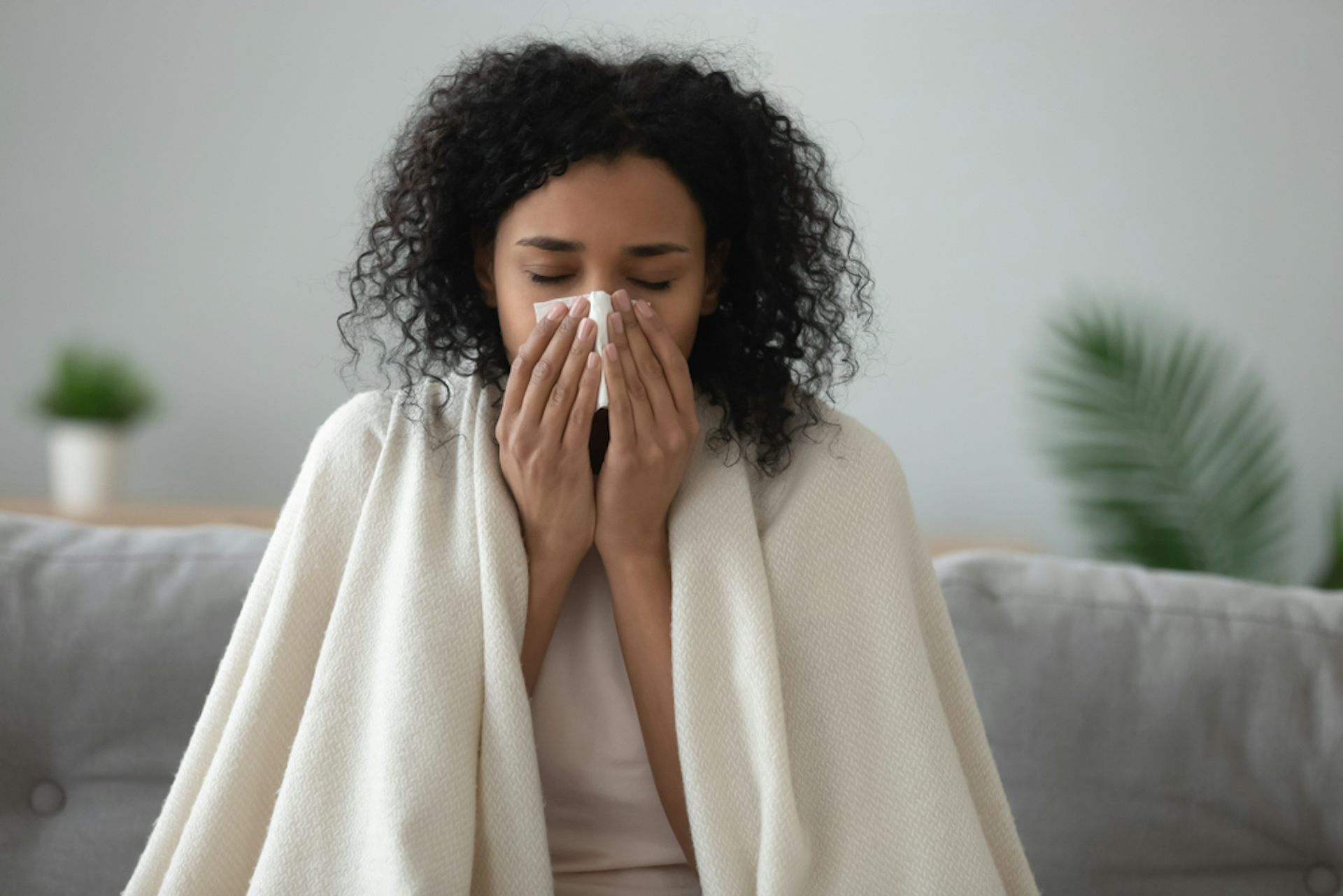 “African young woman covered with blanket blowing running nose.”