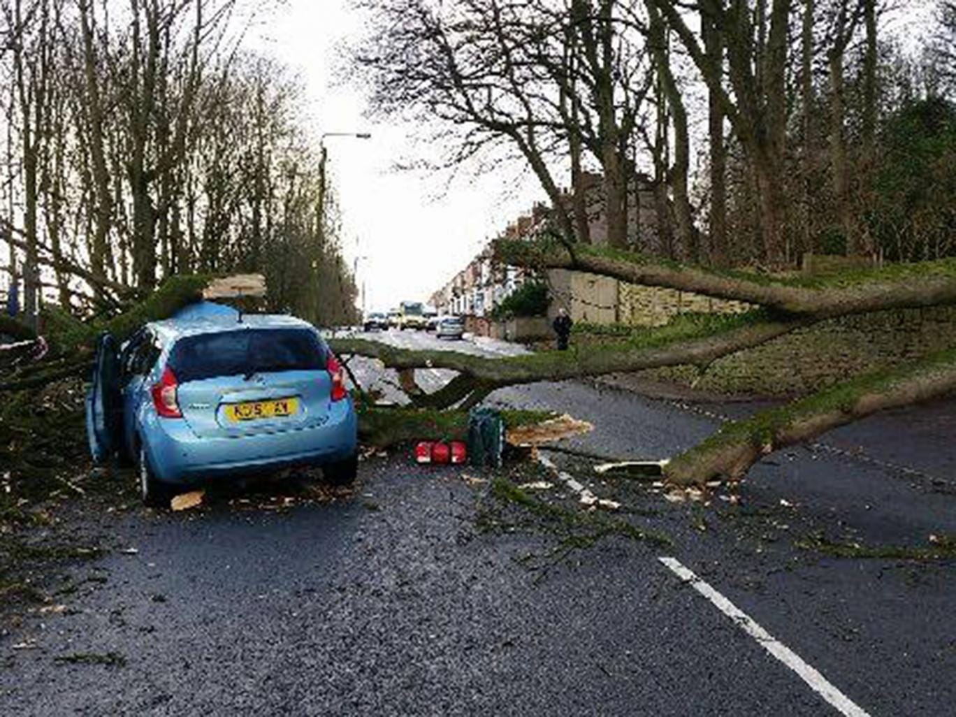 A mother and daughter were driving in Ferryhill Station, Co Durham, when winds uprooted a tree from a garden. It crashed on to the bonnet of their Nissan Note, bringing down a power cable. Their car was badly damaged.