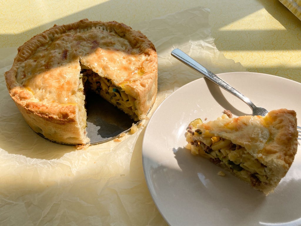 The result is the ultimate comfort food: chewy pasta rounds punctuated with hearty bites of meat and bright-tasting vegetables, all lightly bound with the sauce. It’s baked in a shop-bought pie crust that makes it even more delightful, an unexpected filling within a crust.