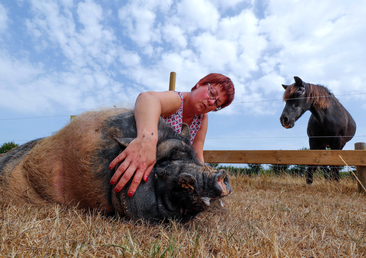 Belgian Valerie Luycx, a founder of the association "Les Petits Vieux" acting as home for dozens of elderly animals, including dogs, cats, pigs and goats, caresses Pastis, a 10-year-old Vietnamese pig, in Chievres, Belgium August 7, 2018. REUTERS/Yves Herman