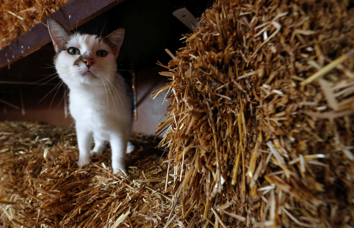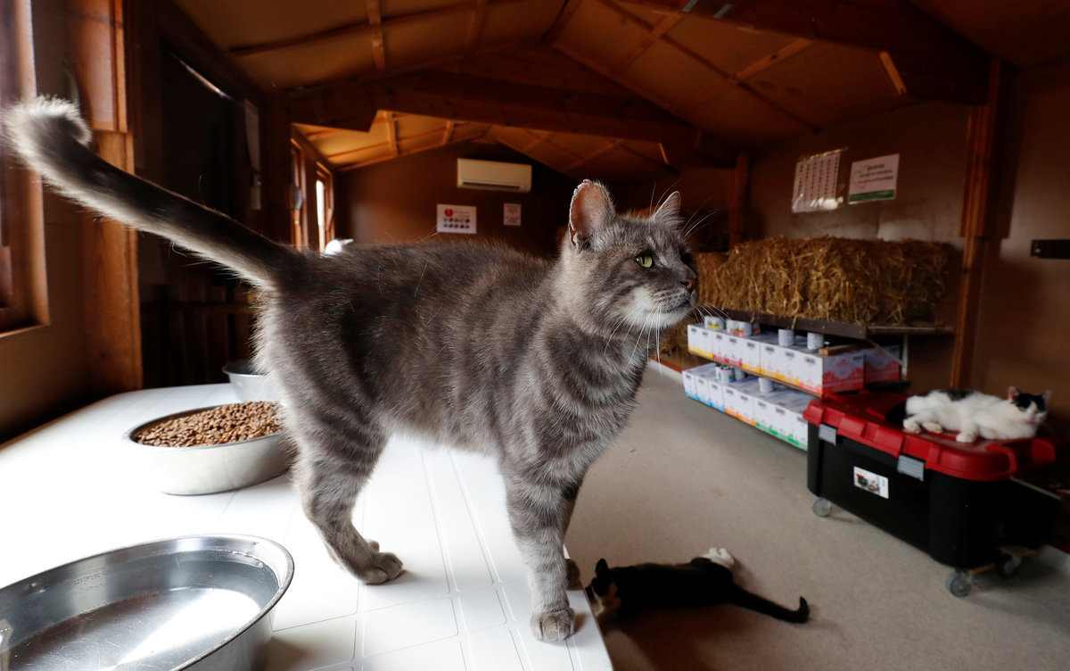 Azuria, a 15-year-old european cat, waits in a building at the association "Les Petits Vieux" acting as home for dozens of elderly animals, including dogs, cats, pigs and goats, in Chievres, Belgium August 7, 2018. REUTERS/Yves Herman