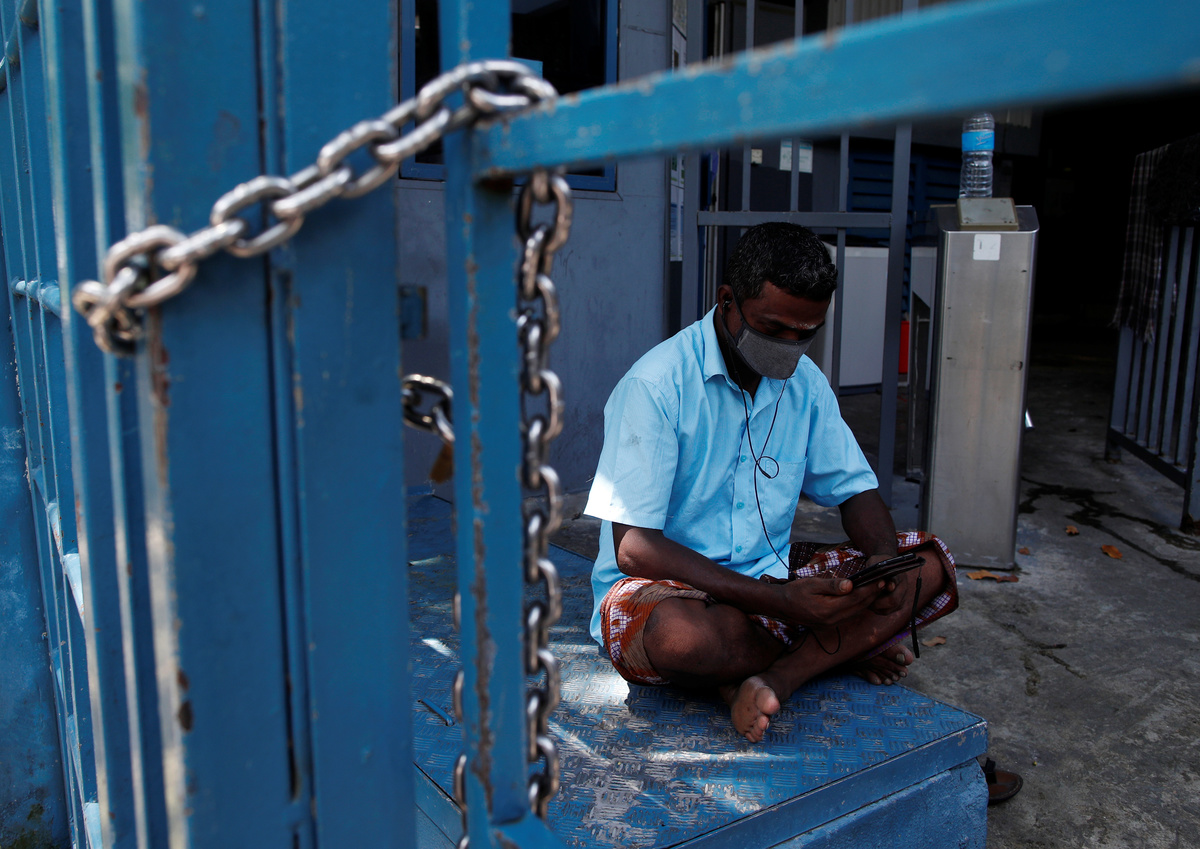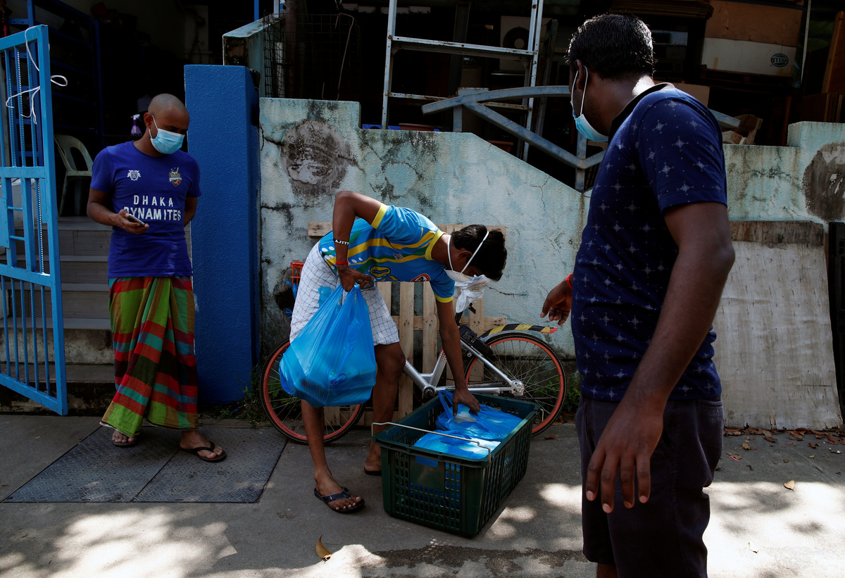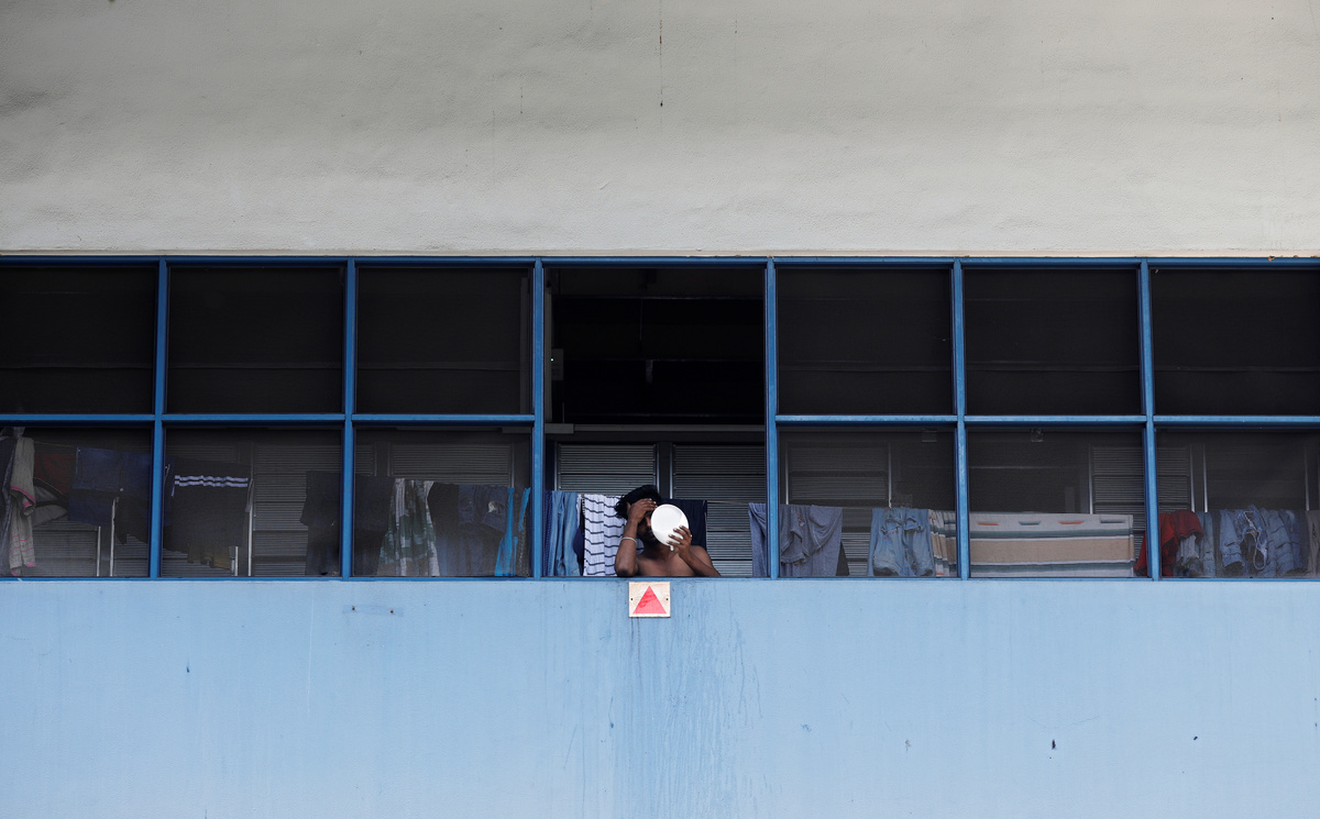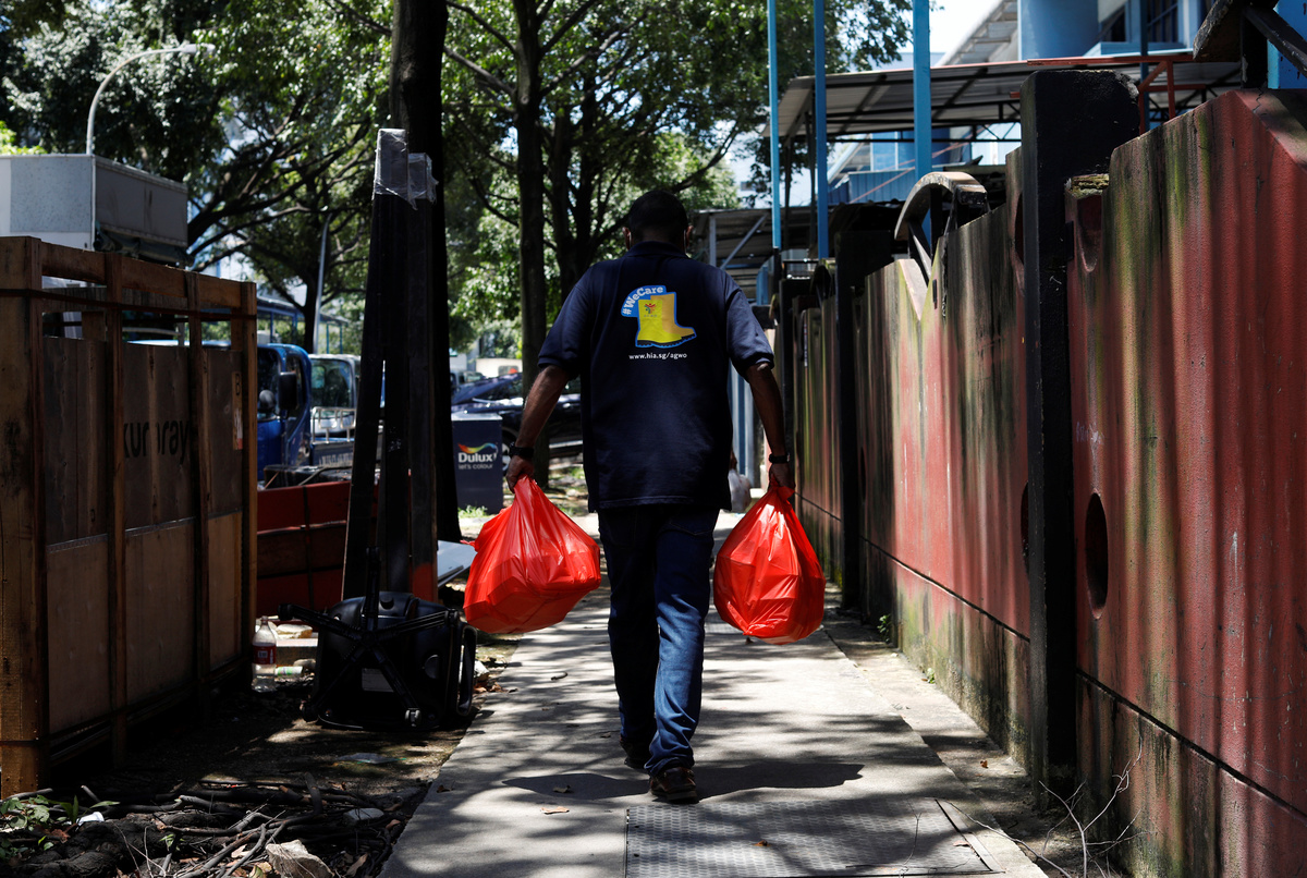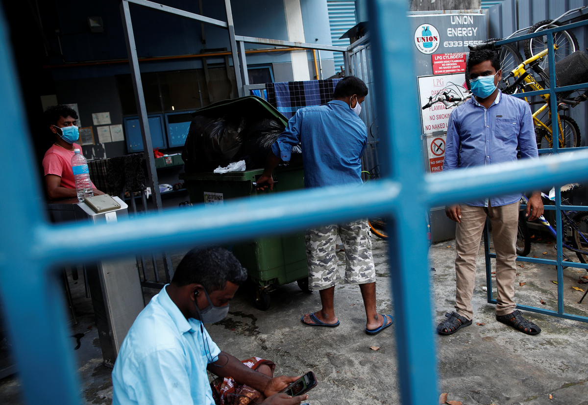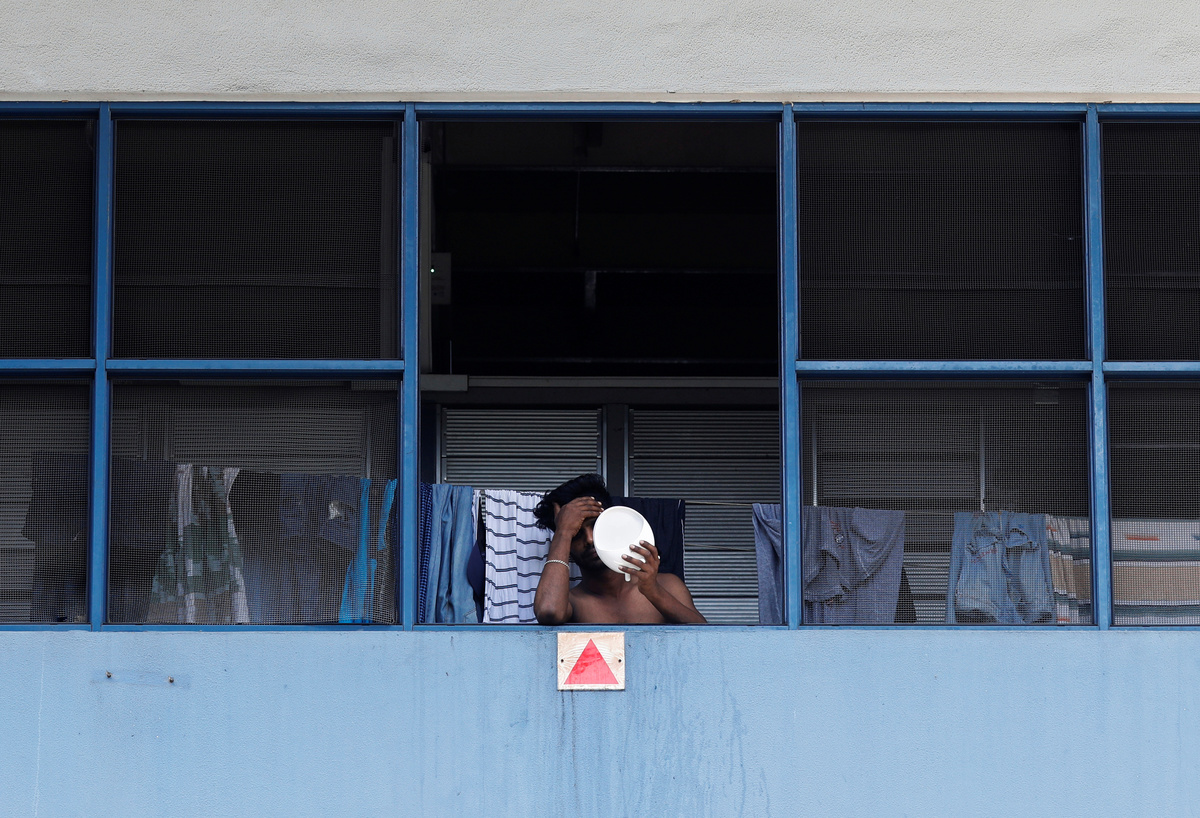 Migrant workers living in a factory-converted dormitories collect the food delivered by, non-governmental organization Alliance of Guest Workers Outreach (AGWO), during the coronavirus disease (COVID-19) outbreak in Singapore April 22, 2020. The NGO oversees the daily delivery of more than 17000 meals to migrant workers living in factory-converted dormitories, whose employers have not stepped up to provide food even as they are unable to leave their dormitories since Monday. REUTERS/Edgar SuA migrant worker living in a factory-converted dormitory shows a meal delivered by non-governmental organization Alliance of Guest Workers Outreach (AGWO) during the coronavirus disease (COVID-19) outbreak in Singapore April 22, 2020. The NGO oversees the daily delivery of more than 17000 meals to migrant workers living in factory-converted dormitories, whose employers have not stepped up to provide food even as they are unable to leave their dormitories since Monday. REUTERS/Edgar SuMigrant workers living in a factory-converted dormitory collect the food delivered by non-governmental organization Alliance of Guest Workers Outreach (AGWO) during the coronavirus disease (COVID-19) outbreak in Singapore April 22, 2020. The NGO oversees the daily delivery of more than 17000 meals to migrant workers living in factory-converted dormitories, whose employers have not stepped up to provide food even as they are unable to leave their dormitories since Monday. REUTERS/Edgar SuA migrant worker living in a factory-converted dormitory watches videos on his phone as he serves his stay-home notice during the coronavirus disease (COVID-19) outbreak in Singapore April 22, 2020. REUTERS/Edgar SuA migrant worker living in a factory-converted dormitory looks into a mirror as he serves his stay-home notice during the coronavirus disease (COVID-19) outbreak in Singapore April 22, 2020. REUTERS/Edgar SuA migrant worker living in a factory-converted dormitories collects the food delivered by, non-governmental organization Alliance of Guest Workers Outreach (AGWO), during the coronavirus disease (COVID-19) outbreak in Singapore April 22, 2020. The NGO oversees the daily delivery of more than 17000 meals to migrant workers living in factory-converted dormitories, whose employers have not stepped up to provide food even as they are unable to leave their dormitories since Monday. REUTERS/Edgar SuA migrant worker living in a factory-converted dormitory looks into a mirror as he serves stay-home notice during the coronavirus disease (COVID-19) outbreak in Singapore April 22, 2020. REUTERS/Edgar SuA migrant worker living in a factory-converted dormitory lifts weights as he serves his stay-home notice during the coronavirus disease (COVID-19) outbreak in Singapore April 22, 2020. REUTERS/Edgar SuA migrant worker living in a factory-converted dormitory speaks on the phone as he serves his stay-home notice during the coronavirus disease (COVID-19) outbreak in Singapore April 22, 2020. REUTERS/Edgar SuA migrant worker living in a factory-converted dormitory locks the gate of their dormitory as they serve stay-home notices during the coronavirus disease (COVID-19) outbreak in Singapore April 22, 2020. REUTERS/Edgar SuMigrant workers living in a factory-converted dormitory clear the trash as they serve stay-home notices during the coronavirus disease (COVID-19) outbreak in Singapore April 22, 2020. REUTERS/Edgar SuMigrant workers living in a factory-converted dormitory wait for meals to be delivered by non-governmental organization Alliance of Guest Workers Outreach (AGWO), during the coronavirus disease (COVID-19) outbreak in Singapore April 22, 2020. The NGO oversees the daily delivery of more than 17000 meals to migrant workers living in factory-converted dormitories, whose employers have not stepped up to provide food even as they are unable to leave their dormitories since Monday. REUTERS/Edgar SuMigrant workers living in a factory-converted dormitory collect the food delivered by, non-governmental organization Alliance of Guest Workers Outreach (AGWO) during the coronavirus disease (COVID-19) outbreak in Singapore April 22, 2020. The NGO oversees the daily delivery of more than 17000 meals to migrant workers living in factory-converted dormitories, whose employers have not stepped up to provide food even as they are unable to leave their dormitories since Monday. REUTERS/Edgar SuA migrant worker living in a factory-converted dormitories collects food delivered by, non-governmental organization Alliance of Guest Workers Outreach (AGWO), during the coronavirus disease (COVID-19) outbreak in Singapore April 22, 2020. The NGO oversees the daily delivery of more than 17000 meals to migrant workers living in factory-converted dormitories, whose employers have not stepped up to provide food even as they are unable to leave their dormitories since Monday. REUTERS/Edgar Su