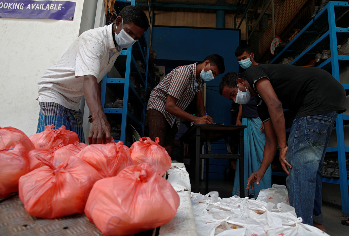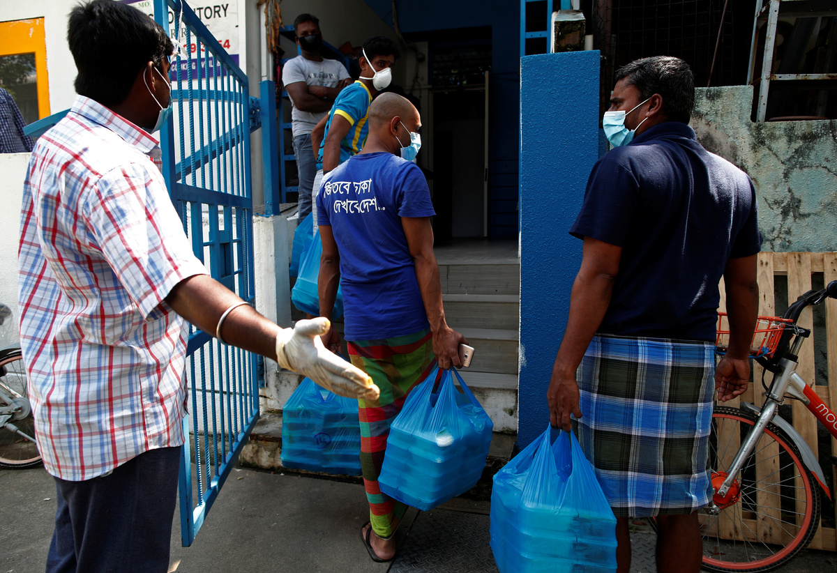 Reverend Samuel Gift Stephen (R) supervises the delivery of food to migrant workers living in factory-converted dormitories during the coronavirus disease (COVID-19) outbreak in Singapore, April 22, 2020. Stephen, chairman of Alliance of Guest Workers Outreach (AGWO), non-governmental organization, oversees the daily delivery of more than 17000 meals to migrant workers living in factory-converted dormitories, whose employers have not stepped up to provide food even as they are unable to leave their dormitories since Monday. REUTERS/Edgar Su
